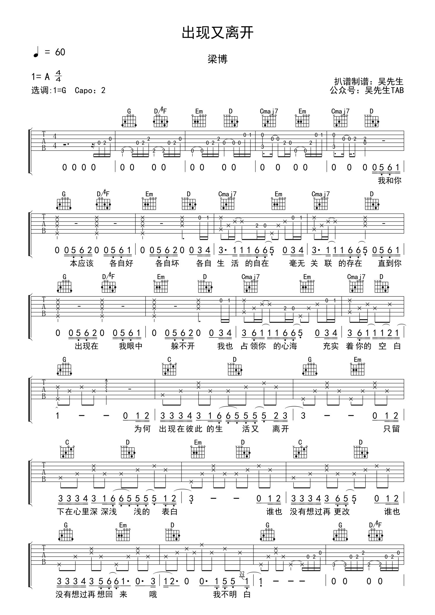 出现又离开吉他谱 - 梁博 - G调吉他弹唱谱