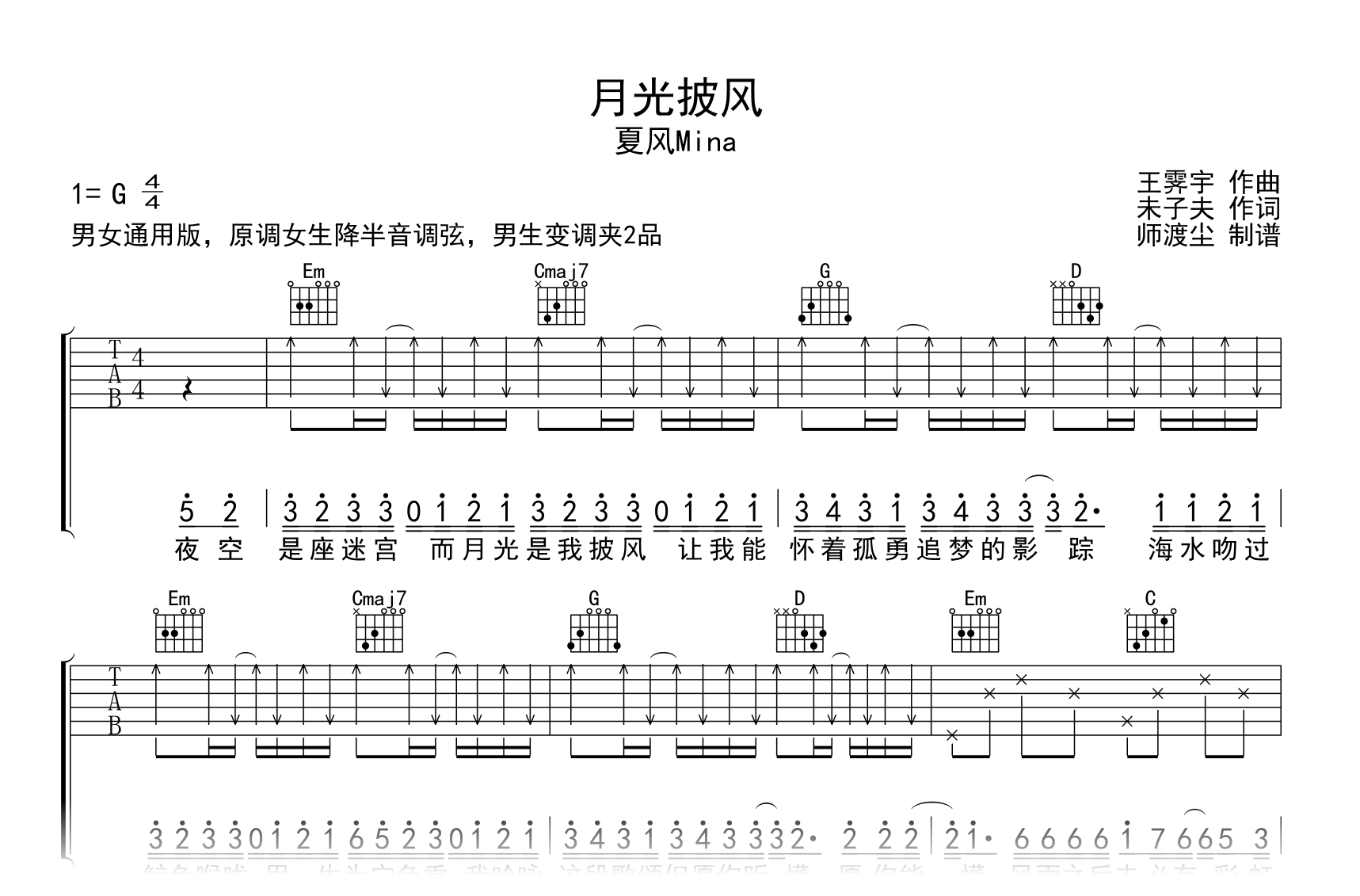 月光披风吉他谱 - 夏风Mina - G调吉他弹唱谱