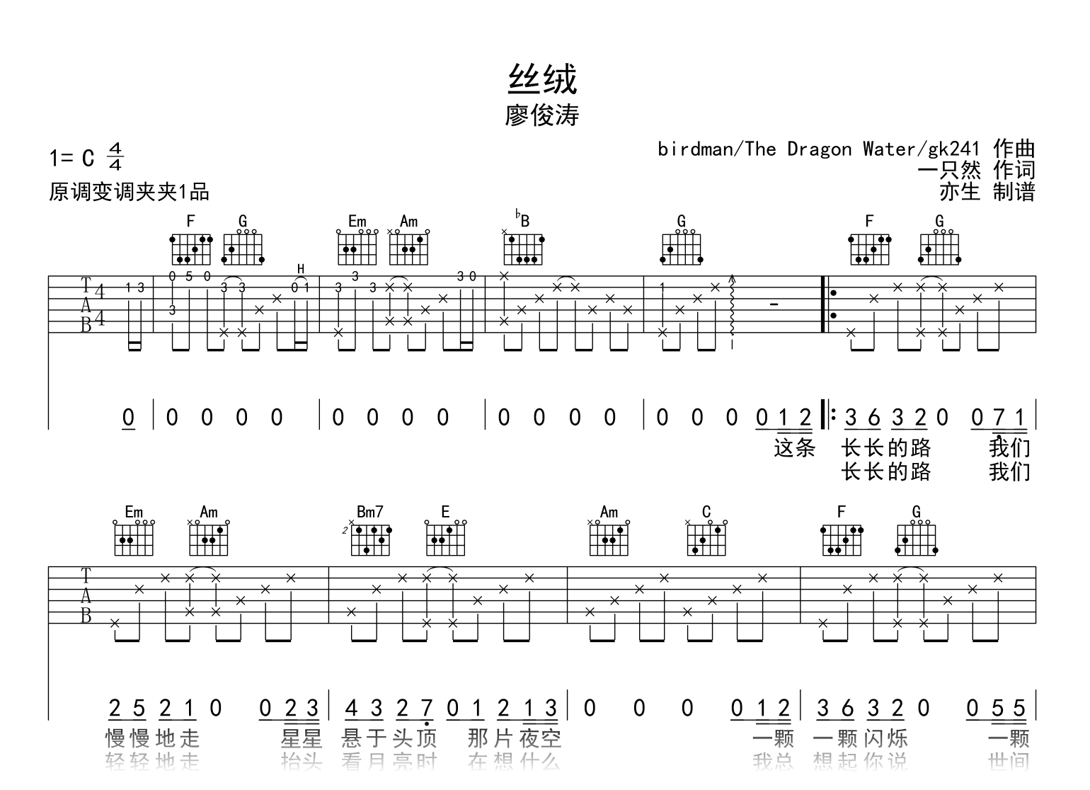 曲谱介绍: 丝绒吉他谱,廖俊涛送给天秤的一首星座幻想曲。《丝绒》吉他弹唱谱,此谱采用C调和弦指法,变调夹夹第1品,节奏4/4拍,演奏速度大约每分钟95拍,演奏难度为简单。
