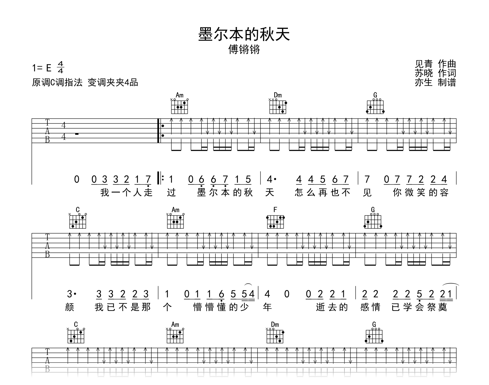 曲谱介绍: 墨尔本的秋天吉他谱,傅锵锵一首关于思念的歌曲,《墨尔本的秋天》吉他弹唱谱,原调E,选用C调和弦编配,变调夹夹第4品,节奏4/4拍,演奏速度大概95拍每分钟,难度简单。