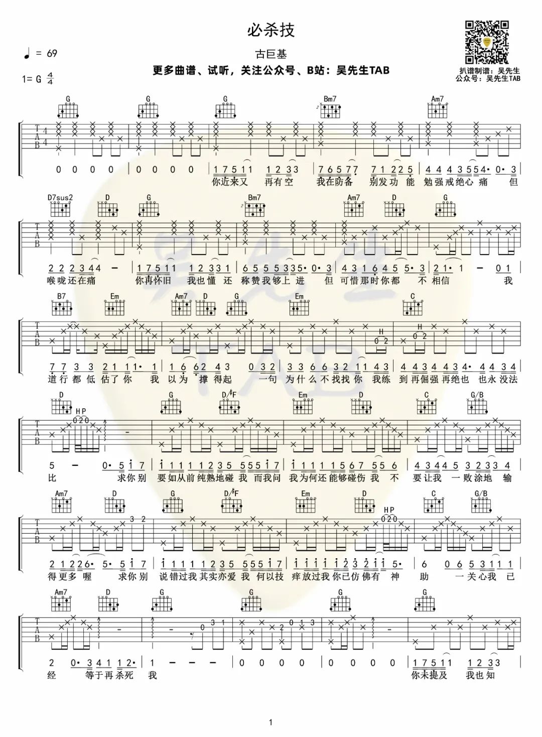 曲谱介绍: 吉他谱介绍:必杀技吉他谱,古巨基演唱的一首歌曲,4/4拍的节奏,这首歌曲的原调为G调,这里曲谱采用了G调指法进行编配,演唱时可不夹变调夹,曲谱由琴谱网更新上传,共3张高清图片弹唱吉他谱例,来源于@吴先生TAB编配出品。