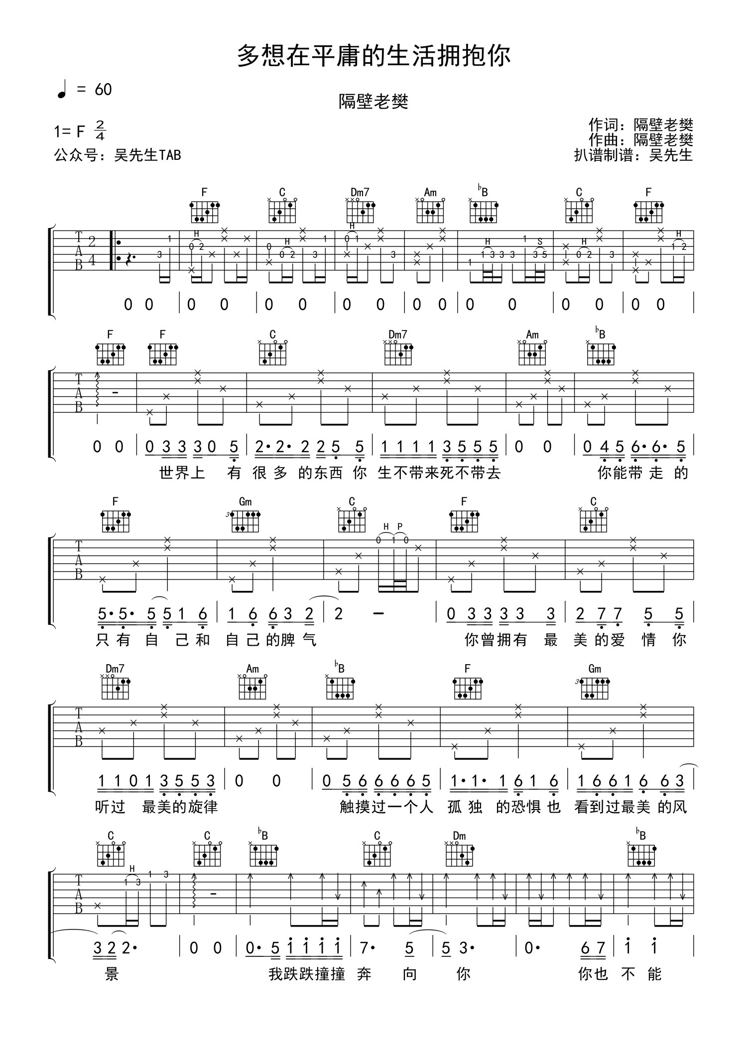 曲谱介绍: 隔壁老樊《多想在平庸的生活拥抱你》吉他谱_F调吉他弹唱谱