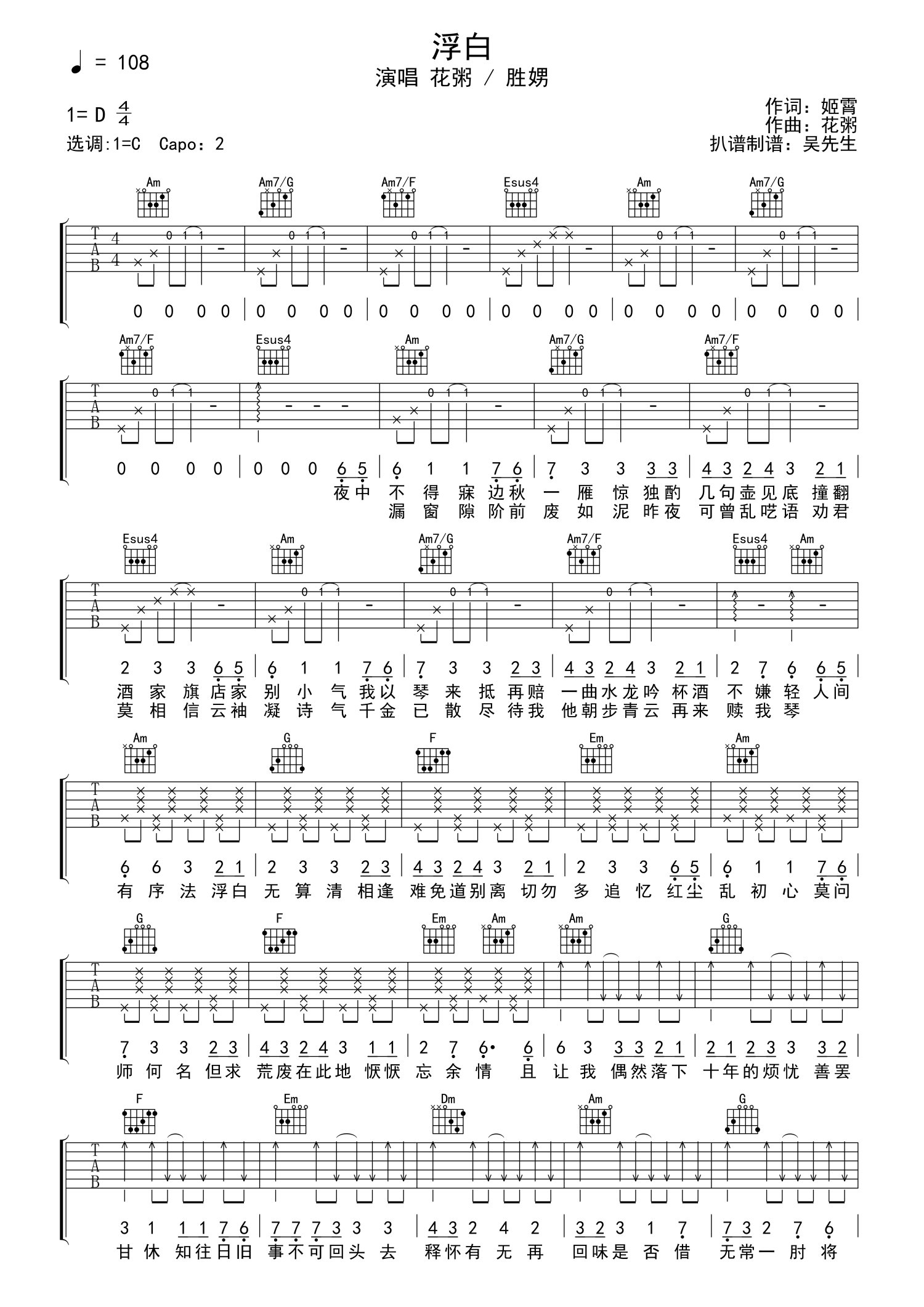 • 浮白吉他谱 - 花粥/王胜男 - C调吉他弹唱谱第1张