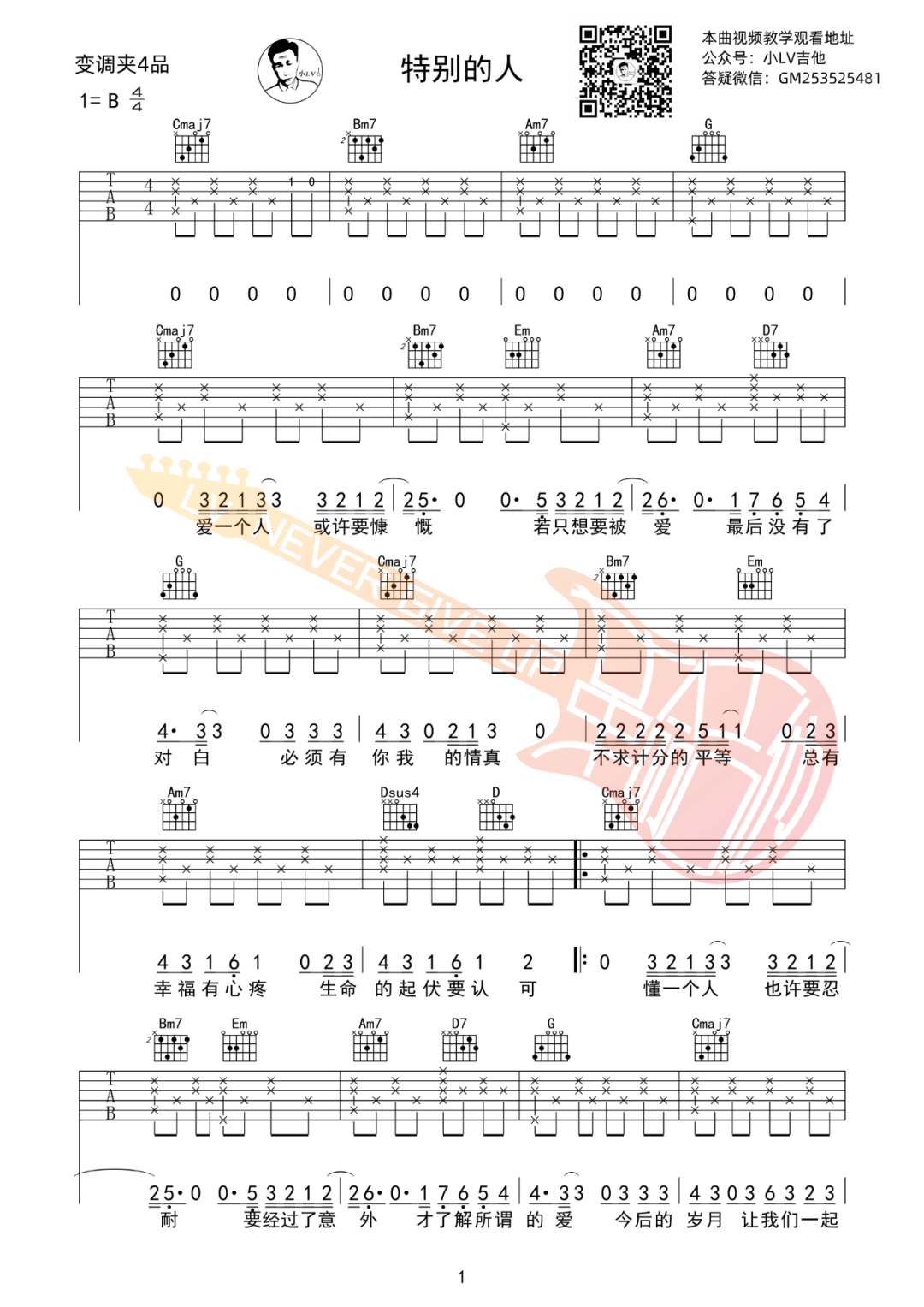 曲谱介绍: 吉他谱介绍:特别的人吉他谱,方大同演唱的一首歌曲,4/4拍的节奏,这首歌曲的原调为B调,这里曲谱采用了G调指法进行编配,演唱时夹变调夹4品可回到原调,也可根据个人实际嗓音情况选择。曲谱由琴谱网更新上传,共3张高清图片弹唱吉他谱例,来源于@革命吉他编配出品。歌曲表达了每个人在生命之中,都在等待一个特别的人,我们总是要在了解了爱与被爱之后,才能清楚看见那个完整自己的人。