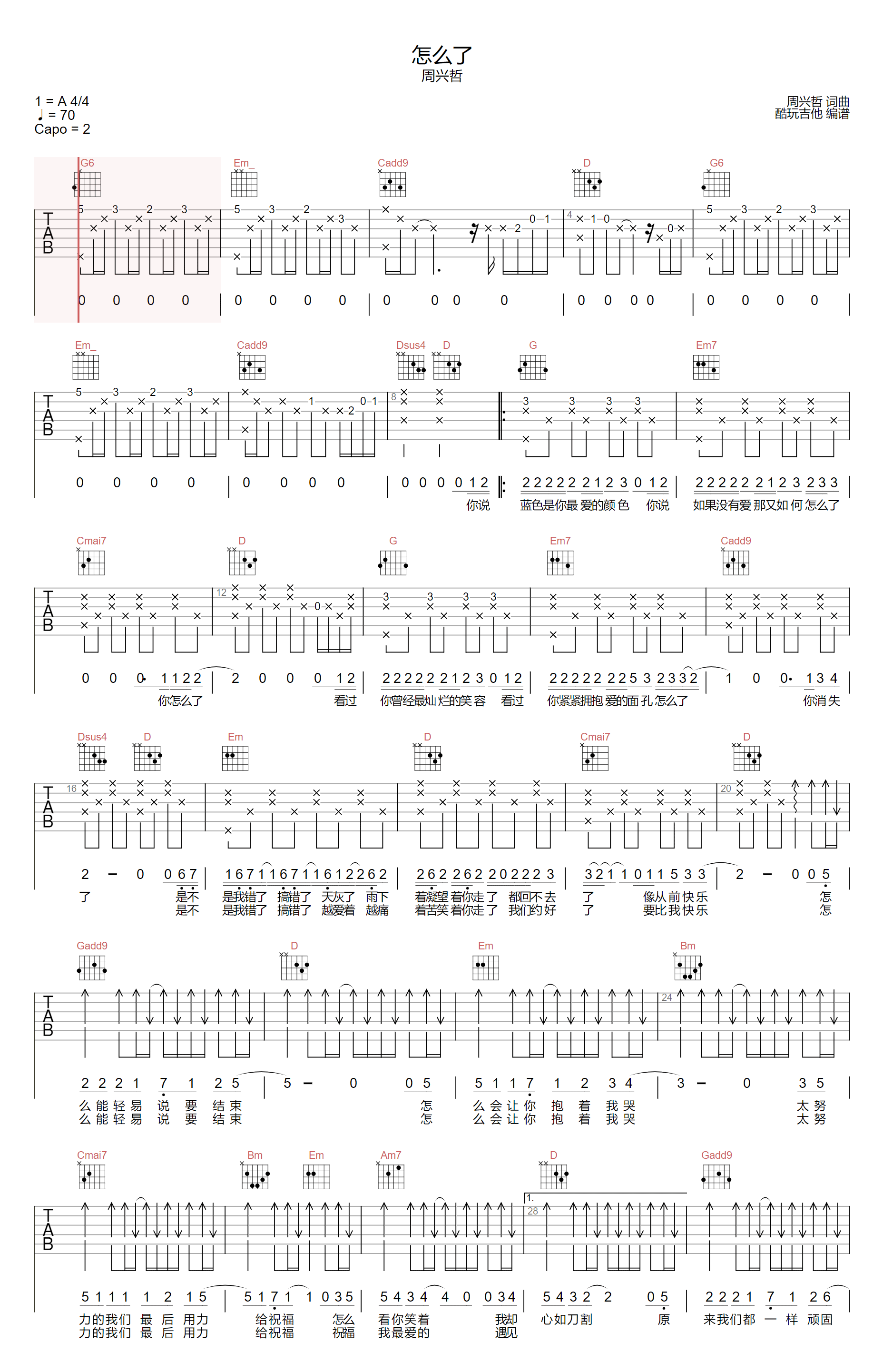 怎么了吉他谱 - 周兴哲 - G调吉他弹唱谱 - 原版