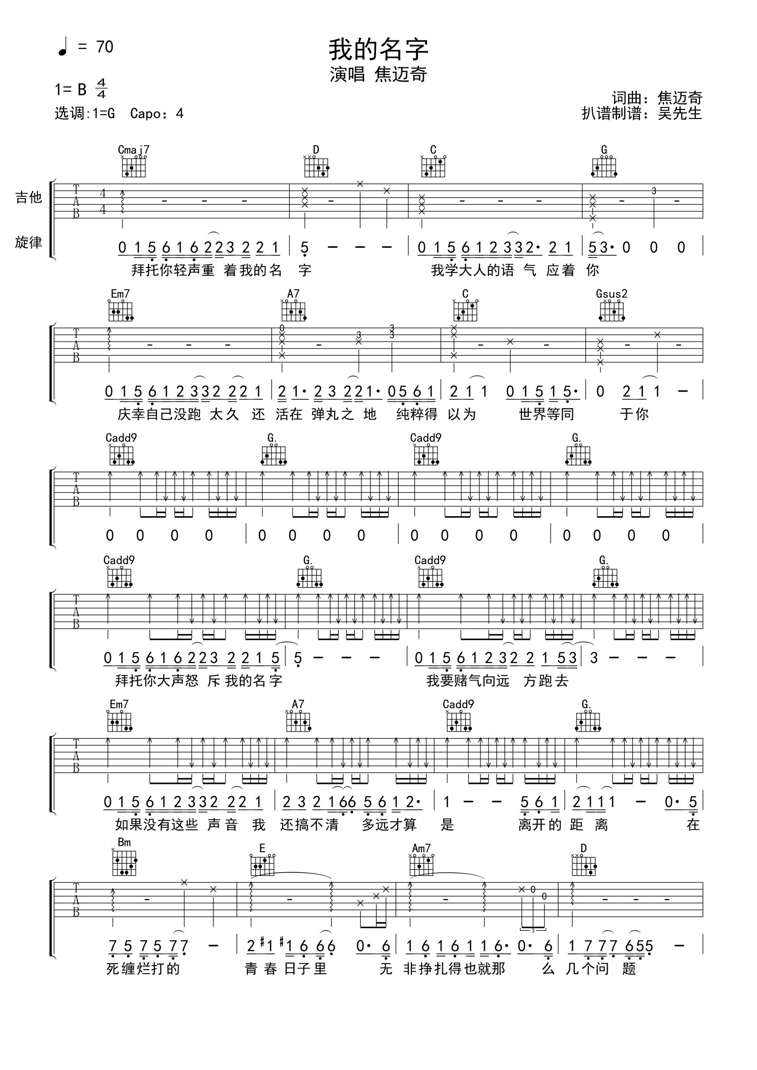 曲谱介绍: 我的名字吉他谱_焦迈奇_《我的名字》G调指法六线谱