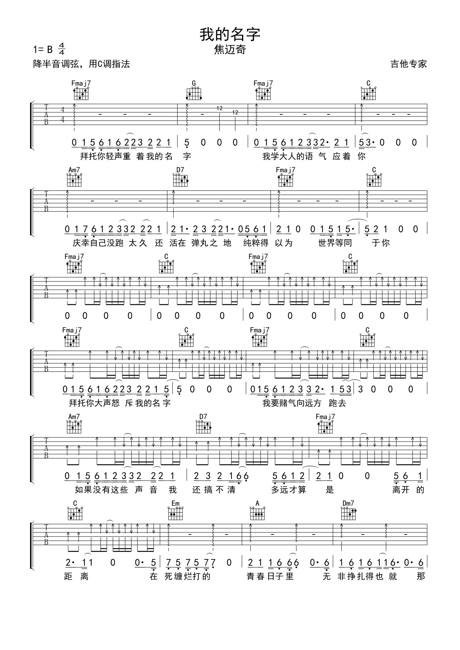 曲谱介绍: 焦迈奇原创歌曲《我的名字》,一半天真,一半忧郁,带着夏天的味道,歌声非常抓耳,越听越舒服。焦迈奇用他的音乐串联起少年的成长脉络,很容易引发人们强烈的共鸣。在死缠烂打的青春日子里,你在挣扎什么,是留下还是离开?是懂得还是舍得?是百无聊赖还是时光可人?是怀疑还是赧然一笑?心之所向,心存期待,这是少年的呼唤。在以你为名的长河里,青春以我为名。C调指法伴奏六线谱,弹唱降半音调弦,原调B调