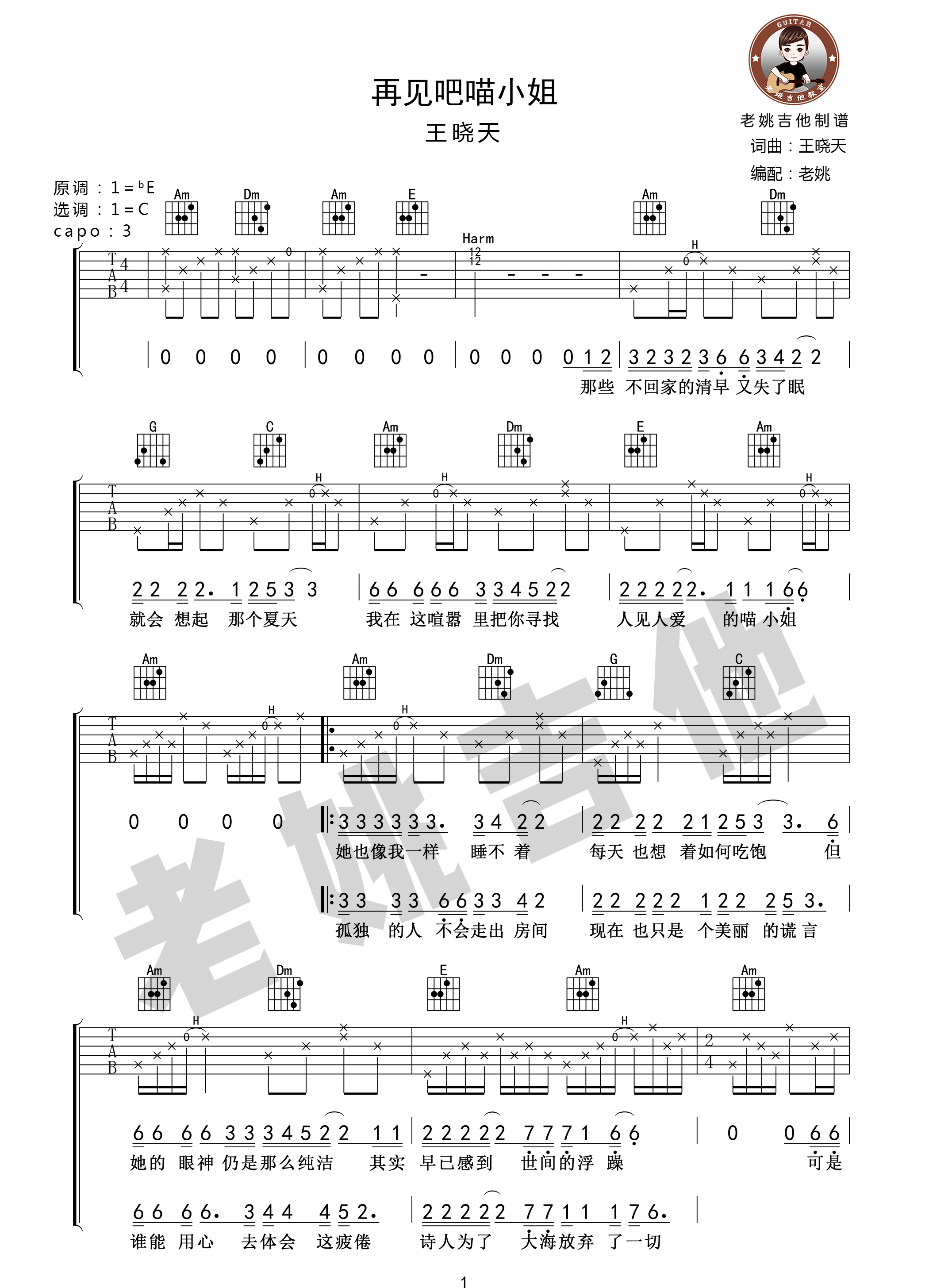 再见吧喵小姐吉他谱 - 王晓天 - C调吉他弹唱谱 - 原版