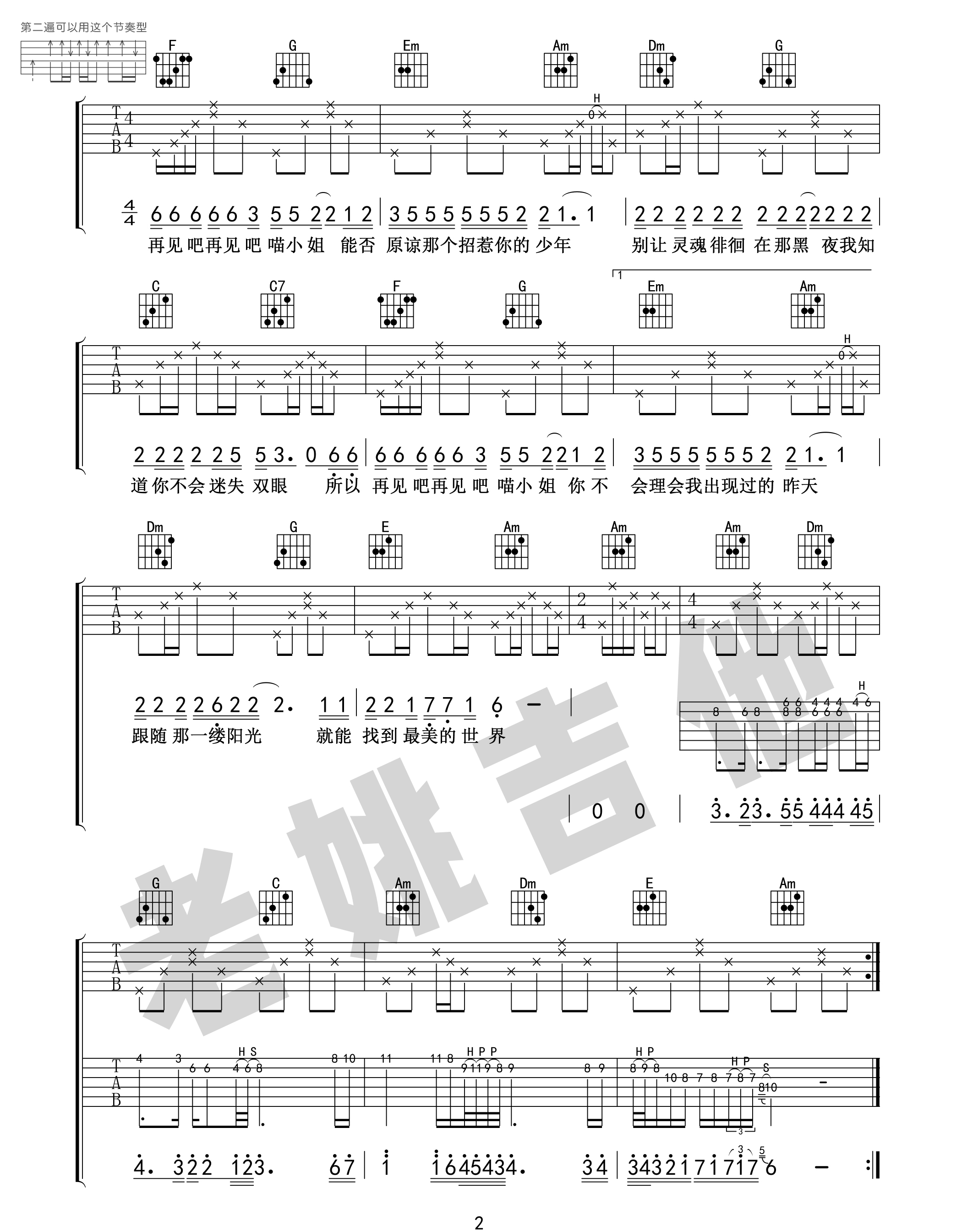 曲谱介绍: 吉他谱介绍:再见吧喵小姐吉他谱,王晓天演唱的一首歌曲,4/4拍的节奏,这首歌曲的原调为降E调,这里曲谱采用了C调指法进行编配,演唱时夹变调夹3品可回到原调,也可根据个人实际嗓音情况选择。曲谱由琴谱网更新上传,共3张高清图片弹唱吉他谱例,来源于@老姚吉他编配出品。