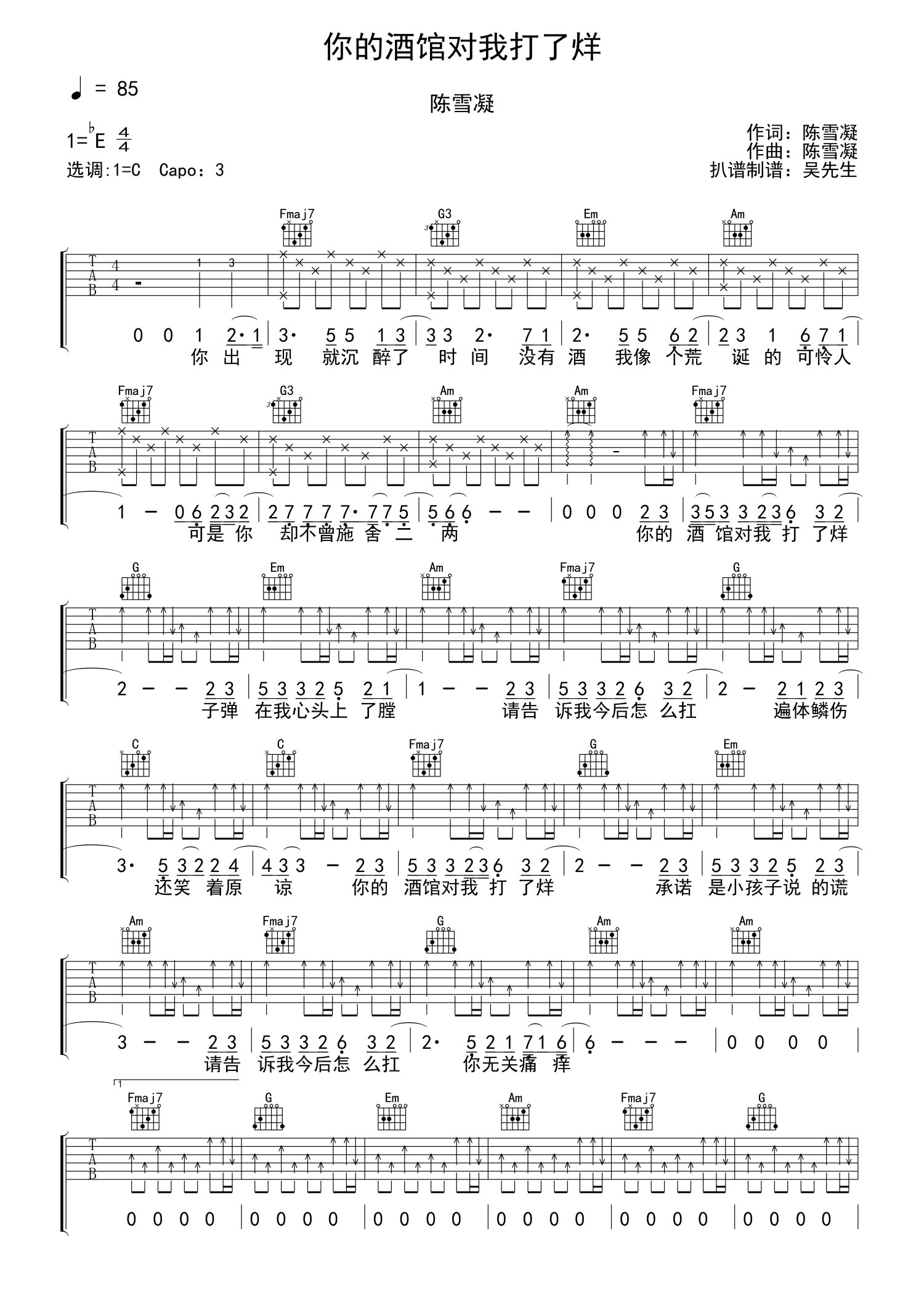 曲谱介绍: 陈雪凝《你的酒馆对我打了烊》吉他谱_C调吉他弹唱谱