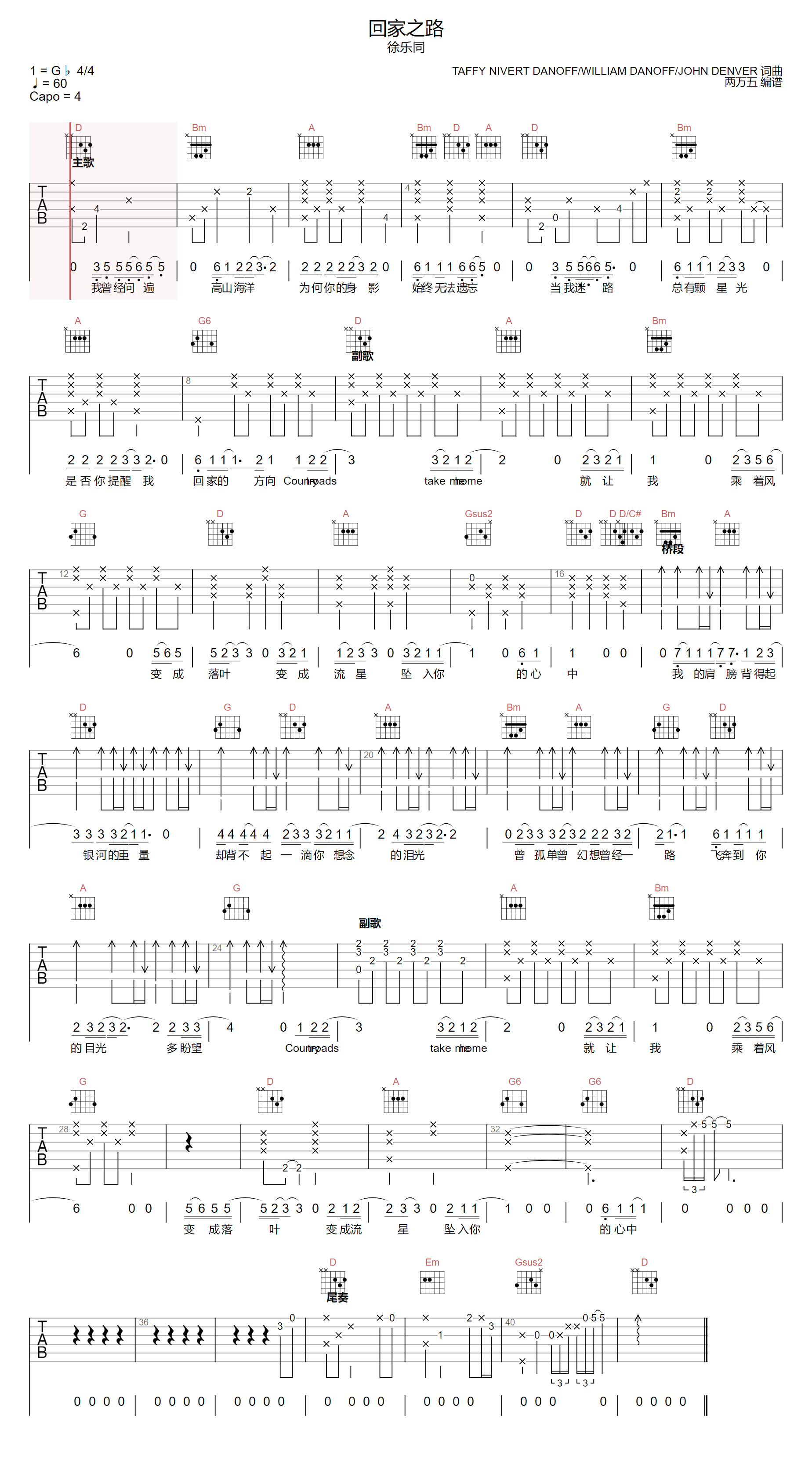 回家之路吉他谱 - 徐乐同 - D调吉他弹唱谱