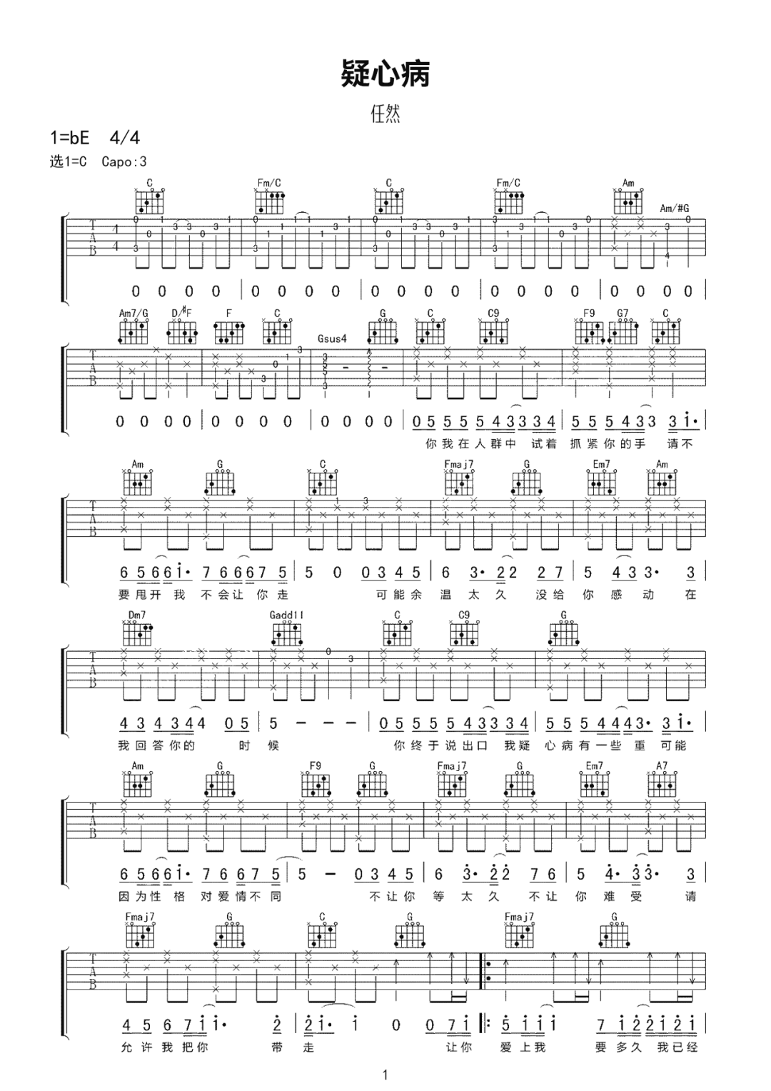疑心病吉他谱 - 任然 - C调吉他弹唱谱 - 原版