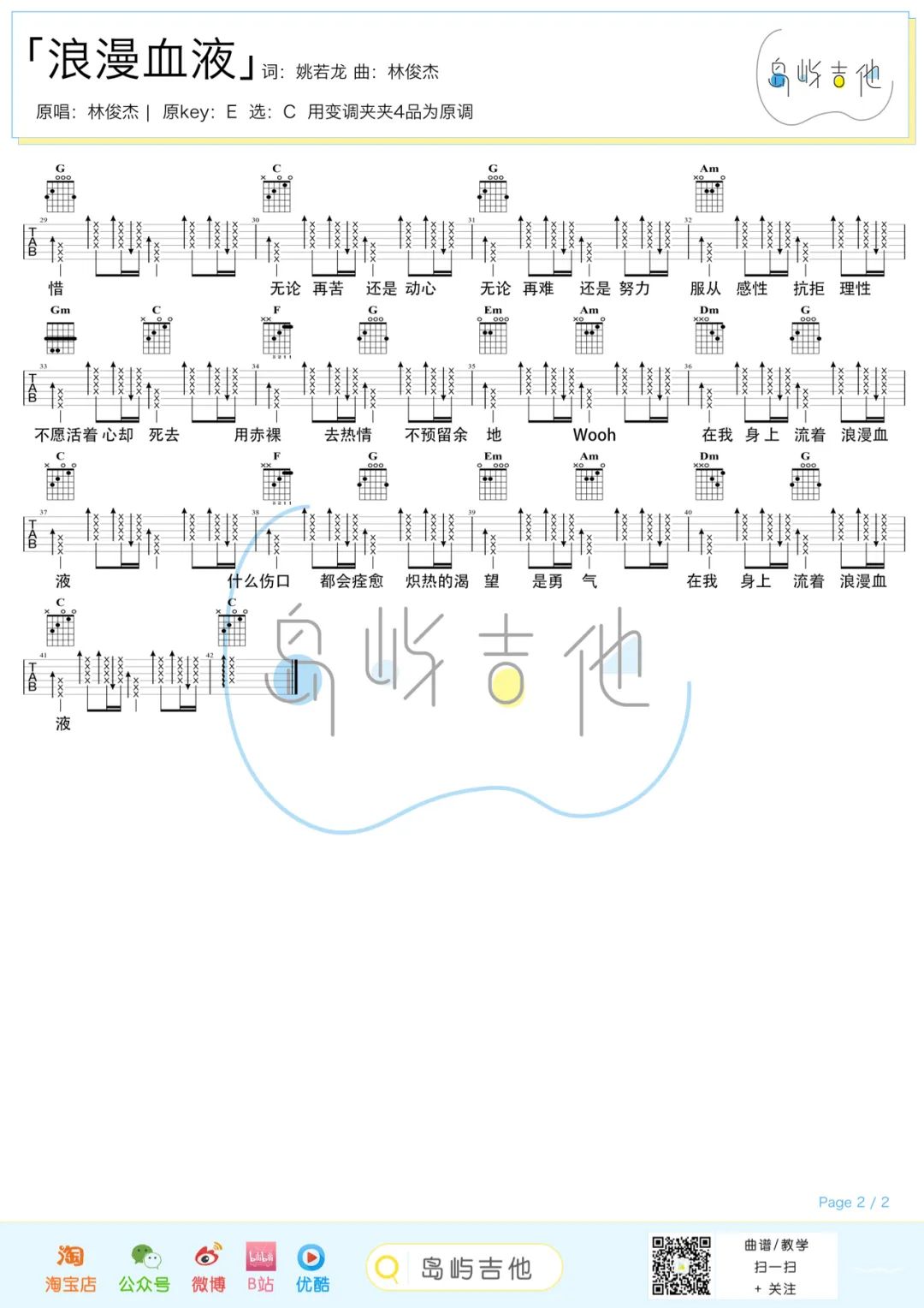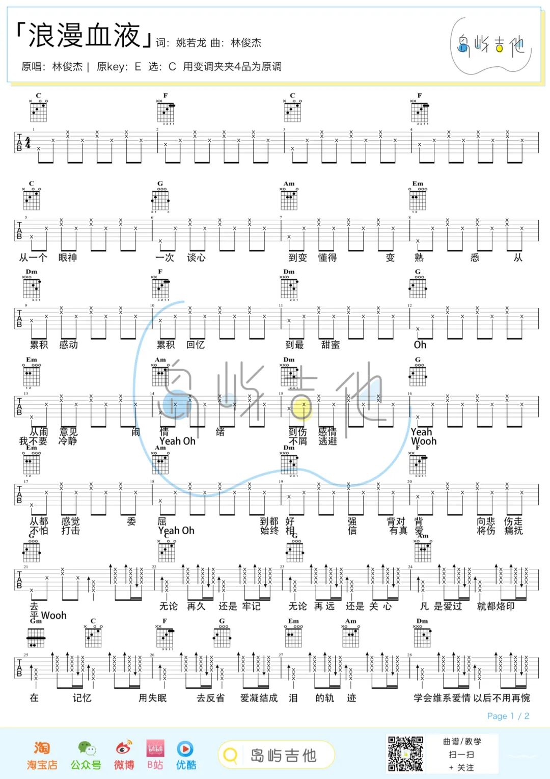 曲谱介绍: 吉他谱介绍:浪漫血液吉他谱,林俊杰演唱的一首歌曲,4/4拍的节奏,这首歌曲的原调为E调,这里曲谱采用了C调指法进行编配,演唱时夹变调夹4品可回到原调,也可根据个人实际嗓音情况选择。曲谱由琴谱网更新上传,共3张高清图片弹唱吉他谱例,来源于@岛屿吉他编配出品。歌曲别具巧思,开头以柔缓的钢琴及沉稳的人声登场,渐渐加入一些回响效果的电子音色,再以吉他、鼓、贝斯做出颇具张力的Band Sound,在后段的过场部分,加入突显合声的巧思,也增加了歌曲的气势。