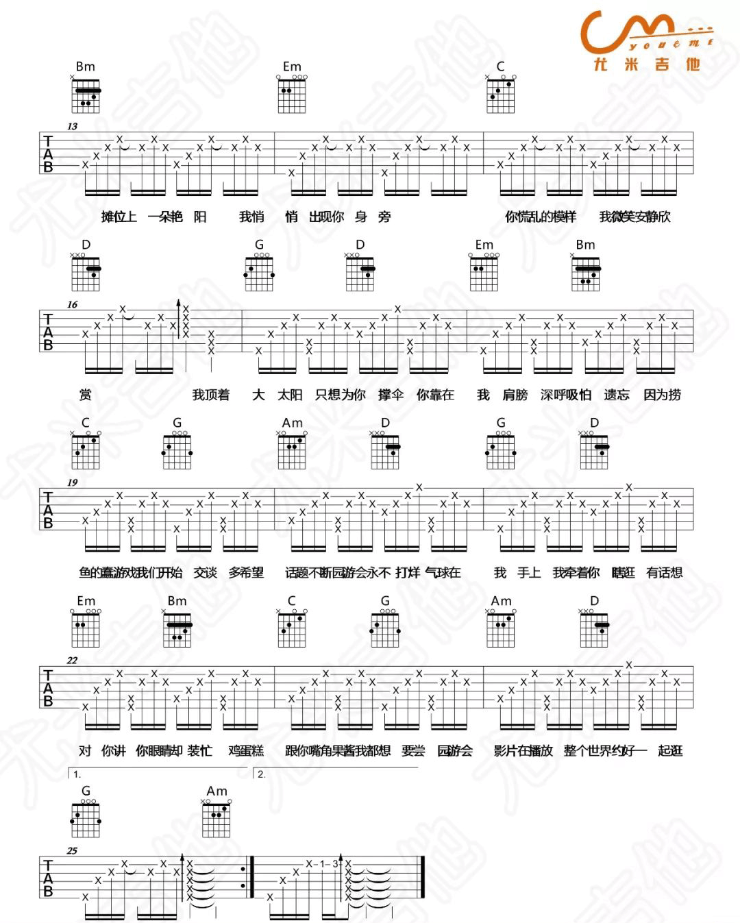 曲谱介绍: 吉他谱介绍:园游会吉他谱,周杰伦演唱的一首歌曲,4/4拍的节奏,这首歌曲的原调为B调,这里曲谱采用了G调指法进行编配,演唱时夹变调夹4品可回到原调,也可根据个人实际嗓音情况选择。曲谱由琴谱网更新上传,共2张高清图片弹唱吉他谱例,来源于@尤米吉他编配出品。这首歌可以隐约听出《暗号》的调调,副歌部分的停顿和反复吟唱带出强烈JAY式R&B风格。园游会是夏天里最好的恋爱场所之一,用来回忆也特别合适。