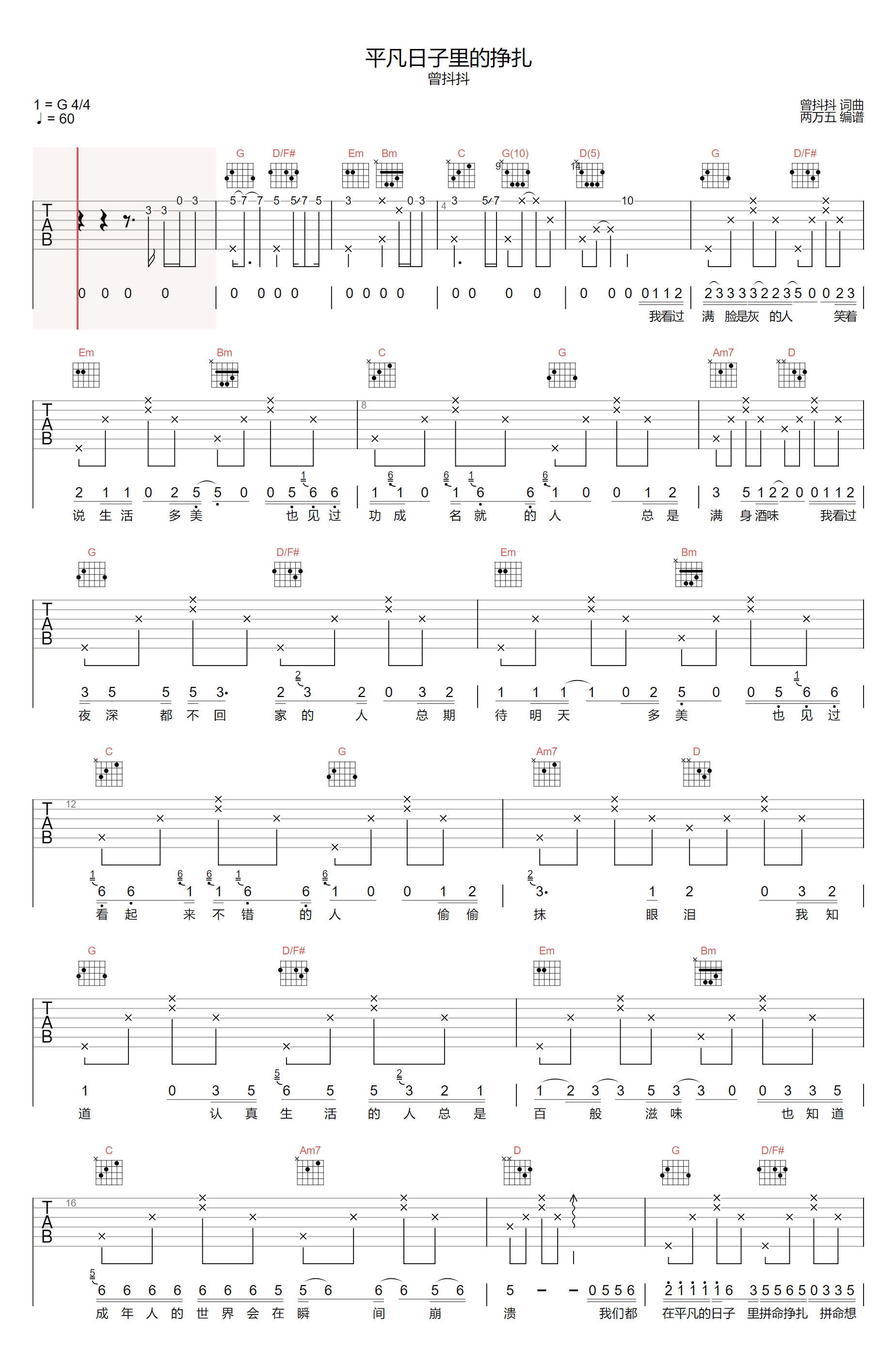 平凡日子里的挣扎吉他谱 - 曾抖抖 - G调吉他弹唱谱 - 原版