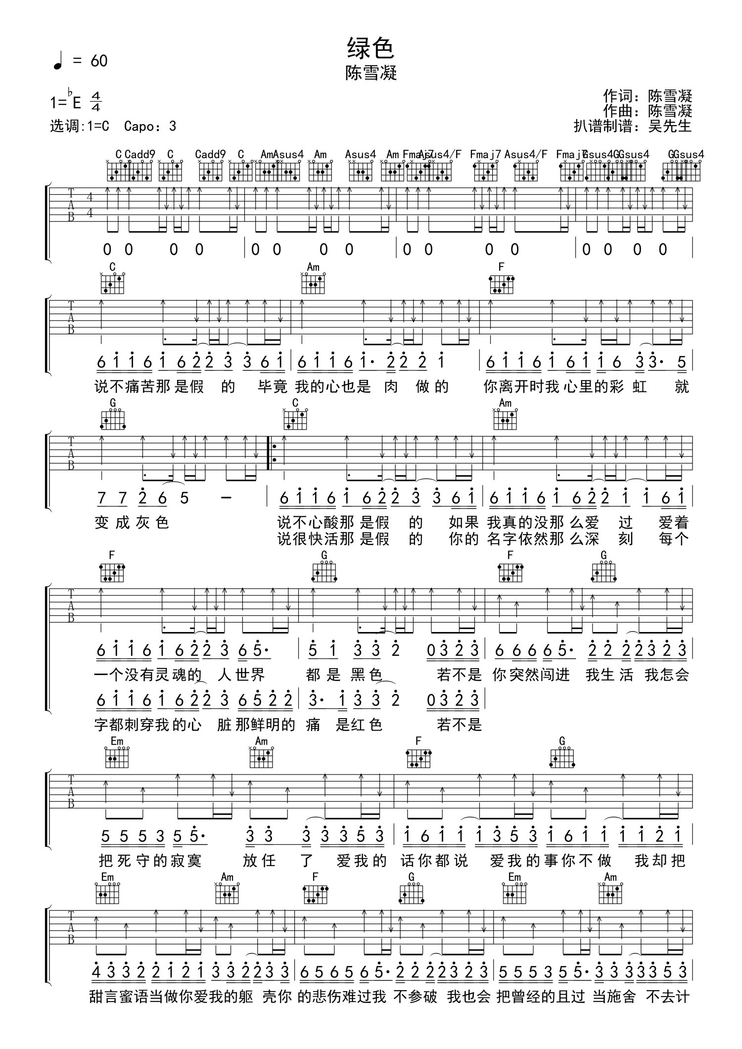 曲谱介绍: 陈雪凝《绿色》吉他谱_六线谱_C调弹唱谱 吴先生编配