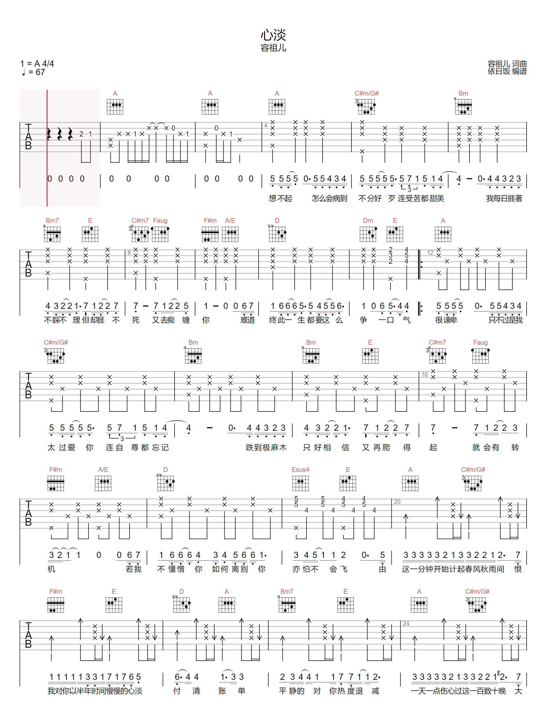 曲谱介绍: 吉他谱介绍:心淡吉他谱,容祖儿演唱的一首歌曲,4/4拍的节奏,这首歌曲的原调为A调,这里曲谱采用了A调指法进行编配,演唱时可不夹变调夹,曲谱由琴谱网更新上传,共2张高清图片弹唱吉他谱例,来源于@依日饭编配出品。这首歌曲是一首带有怨恨的伤感情歌。