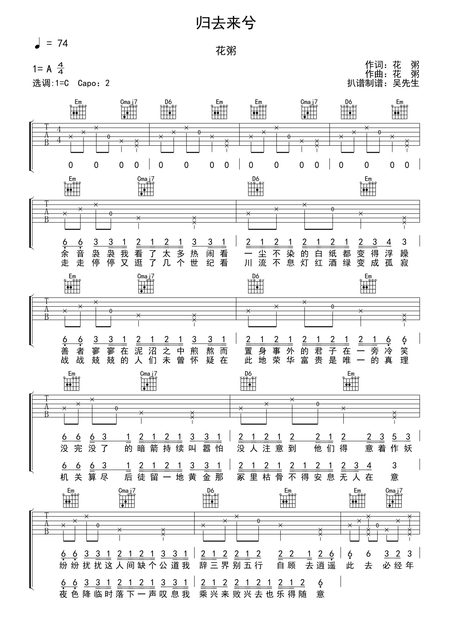 曲谱介绍: 花粥《归去来兮》吉他谱_C调弹唱谱_六线谱
