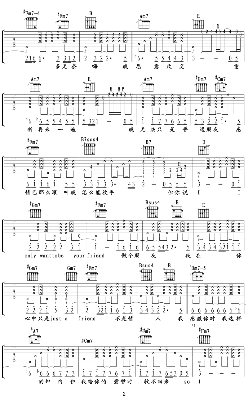 曲谱介绍: 吉他谱介绍:普通朋友吉他谱,陶喆演唱的一首歌曲,4/4拍的节奏,这首歌曲的原调为F调,这里曲谱采用了E调指法进行编配,演唱时夹变调夹1品可回到原调,也可根据个人实际嗓音情况选择。曲谱由琴谱网更新上传,共2张高清图片弹唱吉他谱例,来源于@至尊宝编配出品。在这首歌中陶喆想表达的是,在一起前是普通朋友,分手后是普通朋友,就算我当你是爱人,你却永远待我如普通朋友。唱出伤感又很快放下了的那种感觉,这或许就是R&B的魅力。