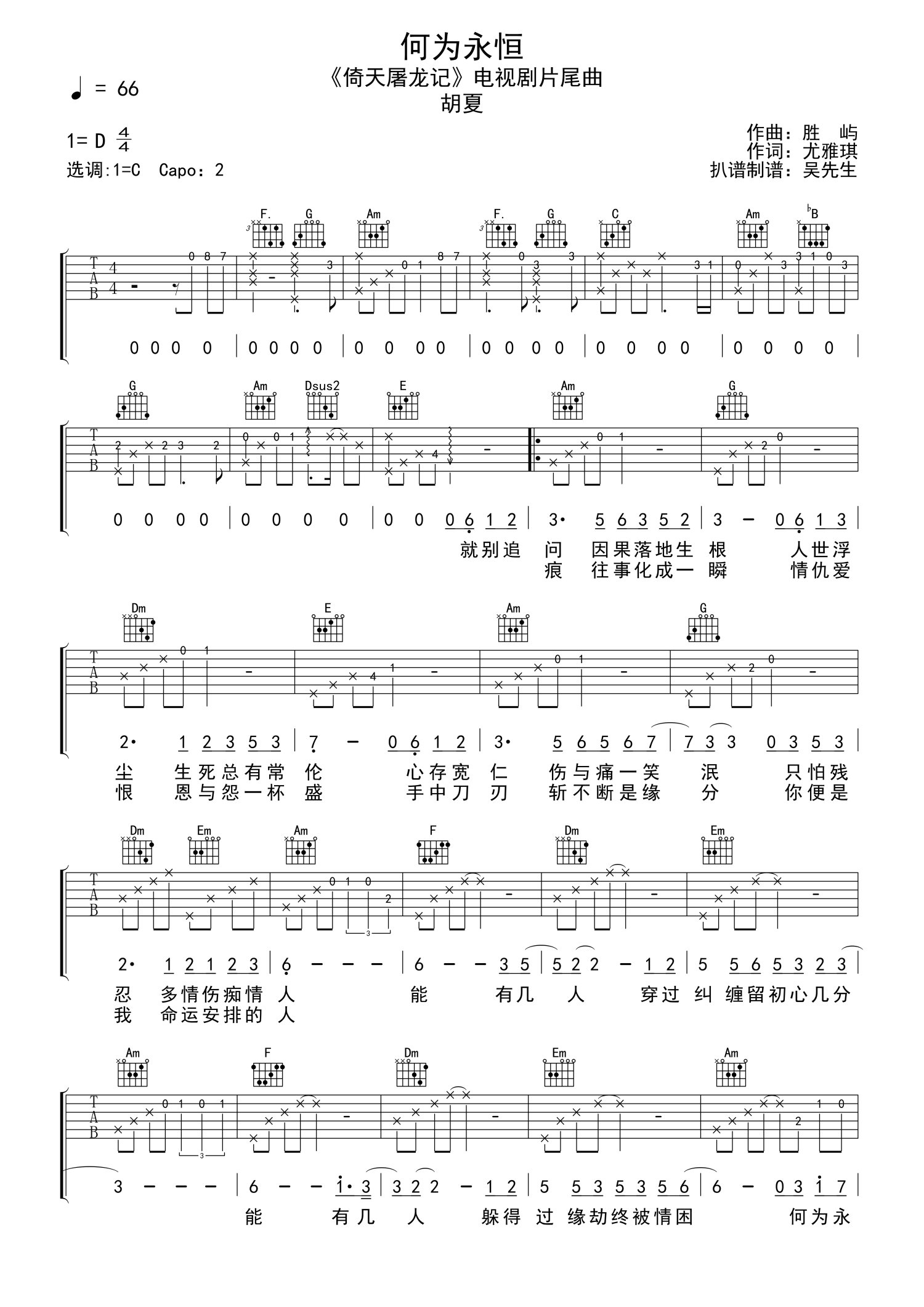 曲谱介绍: 胡夏《何为永恒》吉他谱,新版电视剧《倚天屠龙记》片尾曲,何为永恒六线谱,原调D,选调C,Capo夹二品。高清图片谱