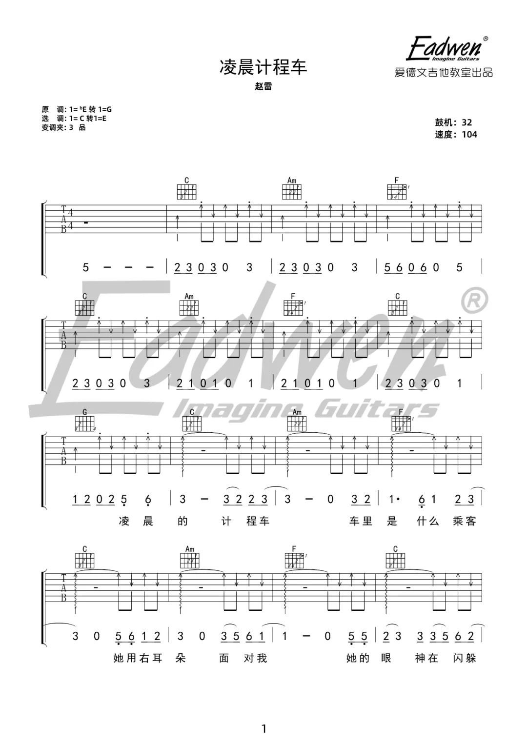 曲谱介绍: 吉他谱介绍:凌晨计程车吉他谱,赵雷演唱的一首歌曲,4/4拍的节奏,这首歌曲的原调为降E调,这里曲谱采用了C调指法进行编配,演唱时夹变调夹3品可回到原调,也可根据个人实际嗓音情况选择。曲谱由琴谱网更新上传,共5张高清图片弹唱吉他谱例,来源于@爱德文吉他教室编配出品。赵雷新专辑里面的一首原创民谣歌曲,话不多说,谱子在,赶紧练习起来吧。