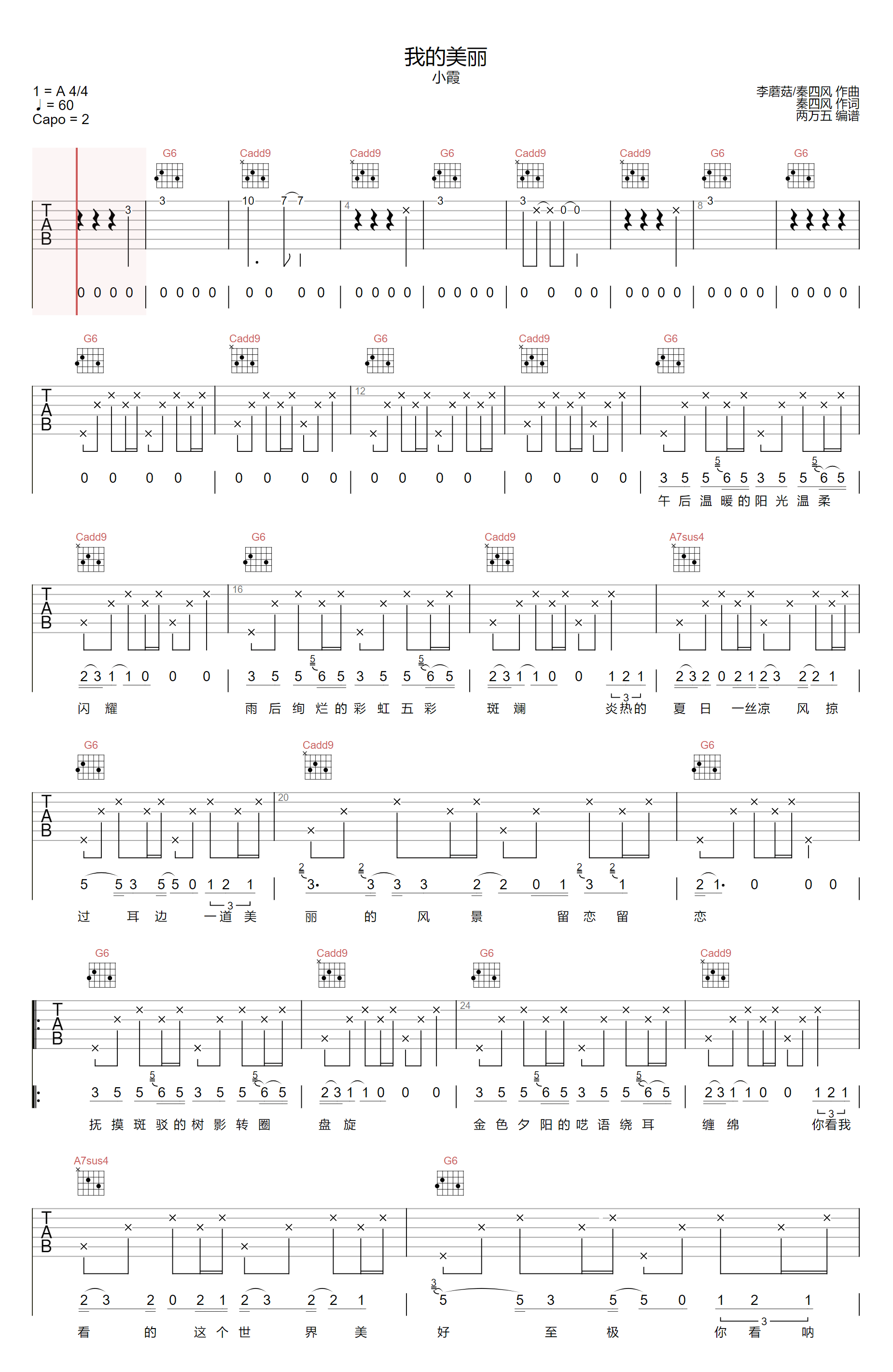 曲谱介绍: 吉他谱介绍:我的美丽吉他谱,黄绮珊演唱的一首歌曲,4/4拍的节奏,这首歌曲的原调为A调,这里曲谱采用了G调指法进行编配,演唱时夹变调夹2品可回到原调,也可根据个人实际嗓音情况选择。曲谱由琴谱网更新上传,共2张高清图片弹唱吉他谱例,来源于@两万五编配出品。