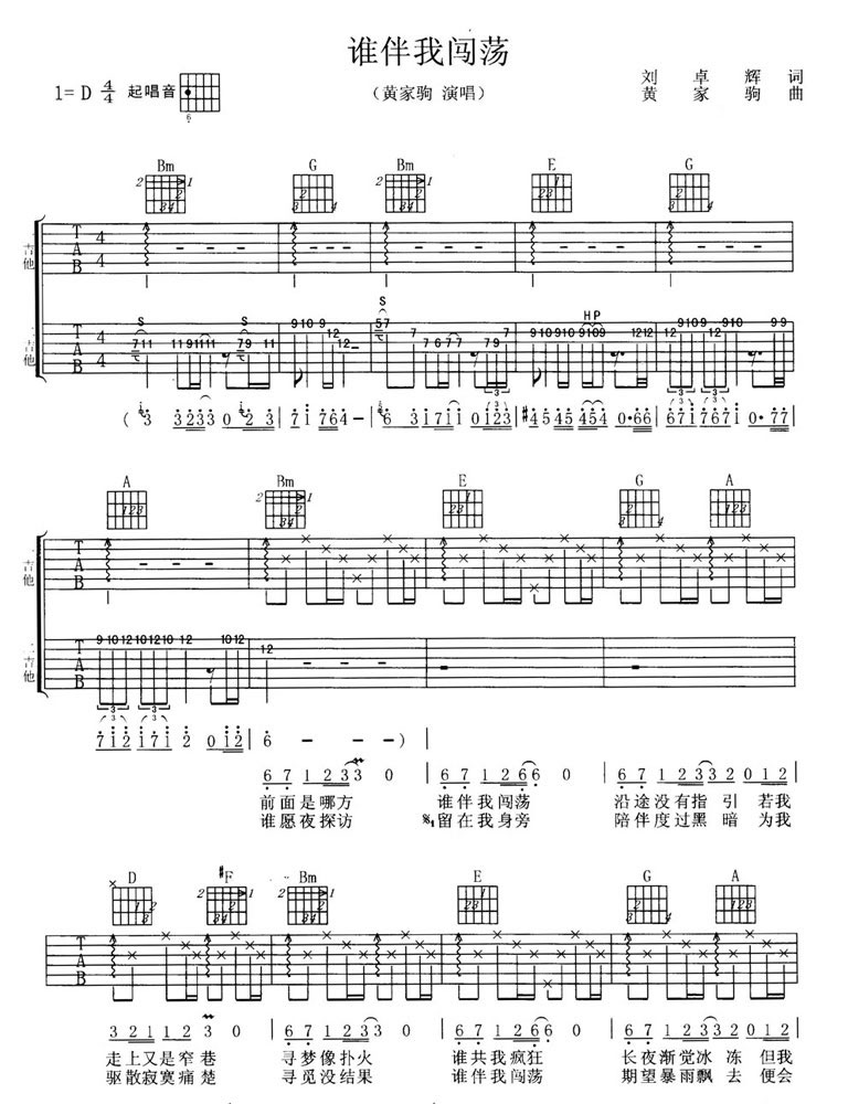 曲谱介绍: 吉他谱介绍:谁伴我闯荡吉他谱,Beyond演唱的一首歌曲,4/4拍的节奏,这首歌曲的原调为D调,这里曲谱采用了D调指法进行编配,演唱时可不夹变调夹,曲谱由琴谱网更新上传,共3张高清图片弹唱吉他谱例,曲谱来源于网络转载,编配制谱者暂不详。