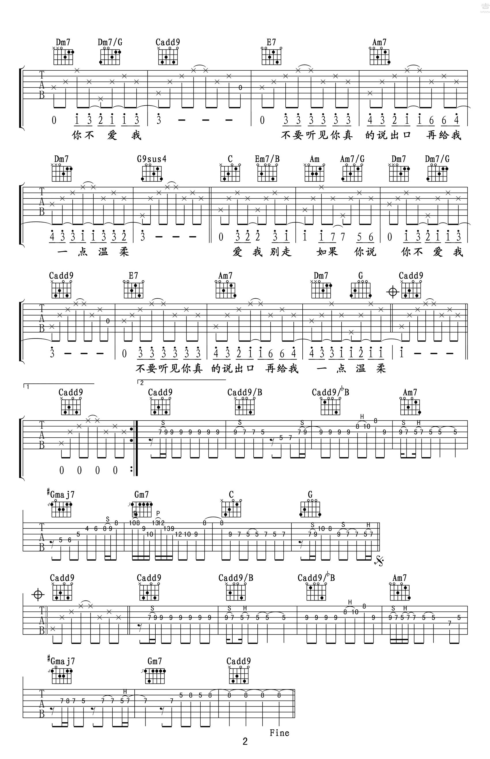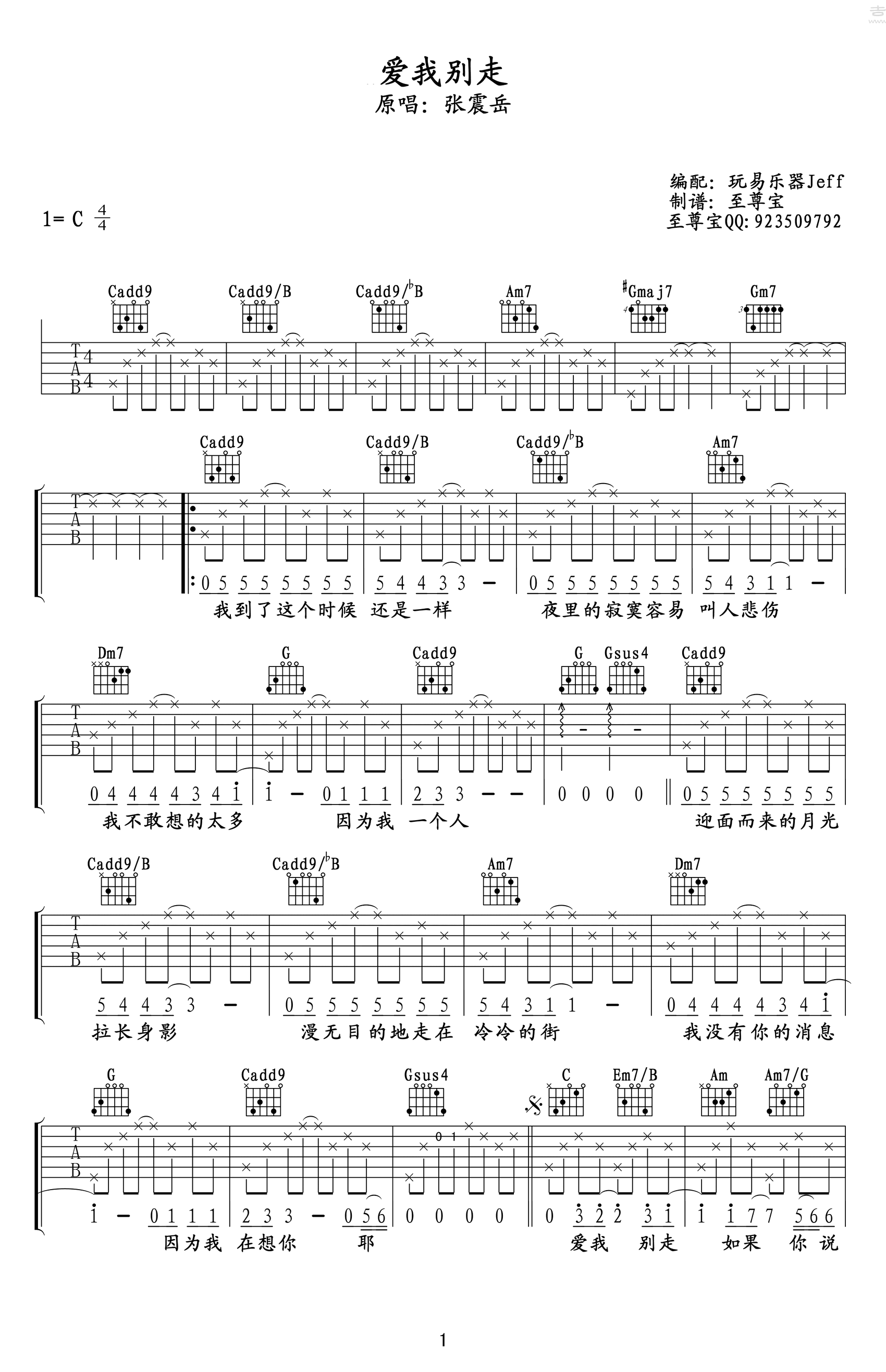 曲谱介绍: 爱我别走,是一个多么想被爱的借口,许多人也许最开始听到这首歌的时候,也许觉得不太符合张震岳的形象,因为谁都没有想到,这样一个看似不羁的人也会有着如此细腻的心思。 张震岳《爱我别走》吉他谱,由@玩易吉他制谱,共有两张图片谱,选用C调指法编配,可不用变调夹,难度较简单,随谱附有《爱我别走》吉他弹唱演示,大家可参考练习。