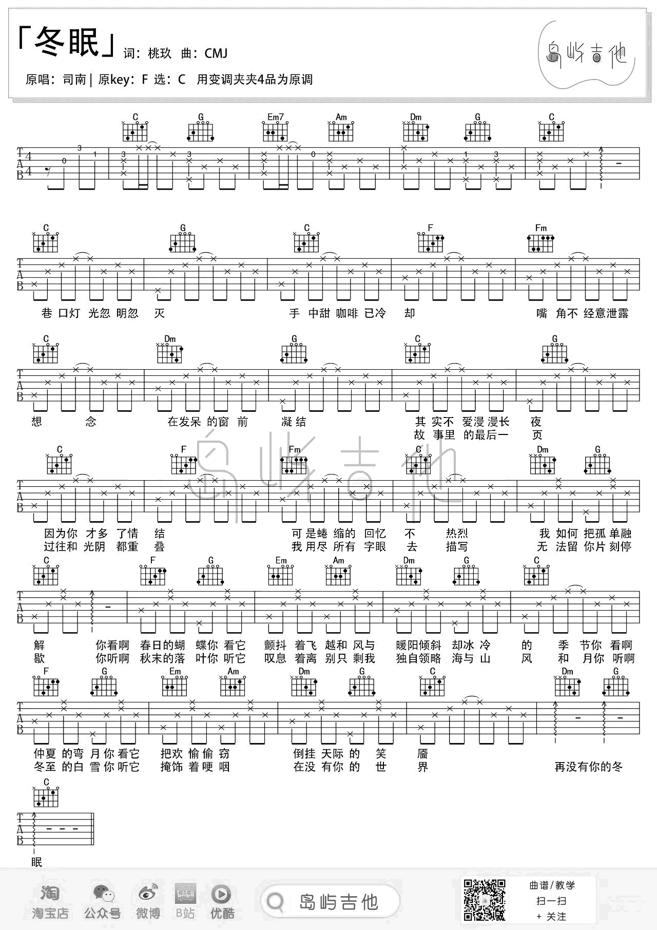 曲谱介绍: 《冬眠》吉他弹唱教学 《冬眠》感受到司南温柔的声音,舒适干净是其主要特点之一。“冬眠”也许想要表达爱情中的孤独和失落。 冬眠吉他谱,由@岛屿吉他制谱,共有1张六线谱+1张和弦谱,选用C调指法,简单版比较适合新手练习,随谱还附有《冬眠》吉他弹唱演示+教学视频,喜欢的朋友可以参考练习。