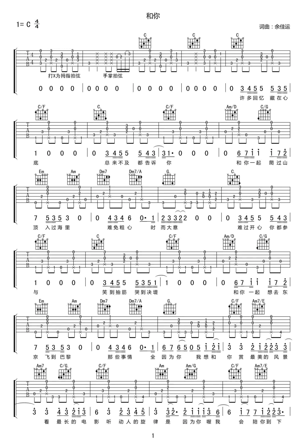 和你吉他谱 - 余佳运 - C调吉他弹唱谱 - 原版