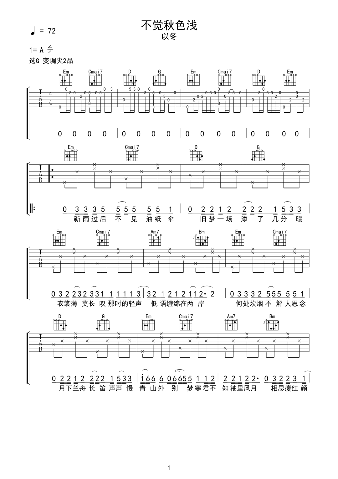 不觉秋色浅吉他谱 - 以冬 - G调吉他弹唱谱 - 原版