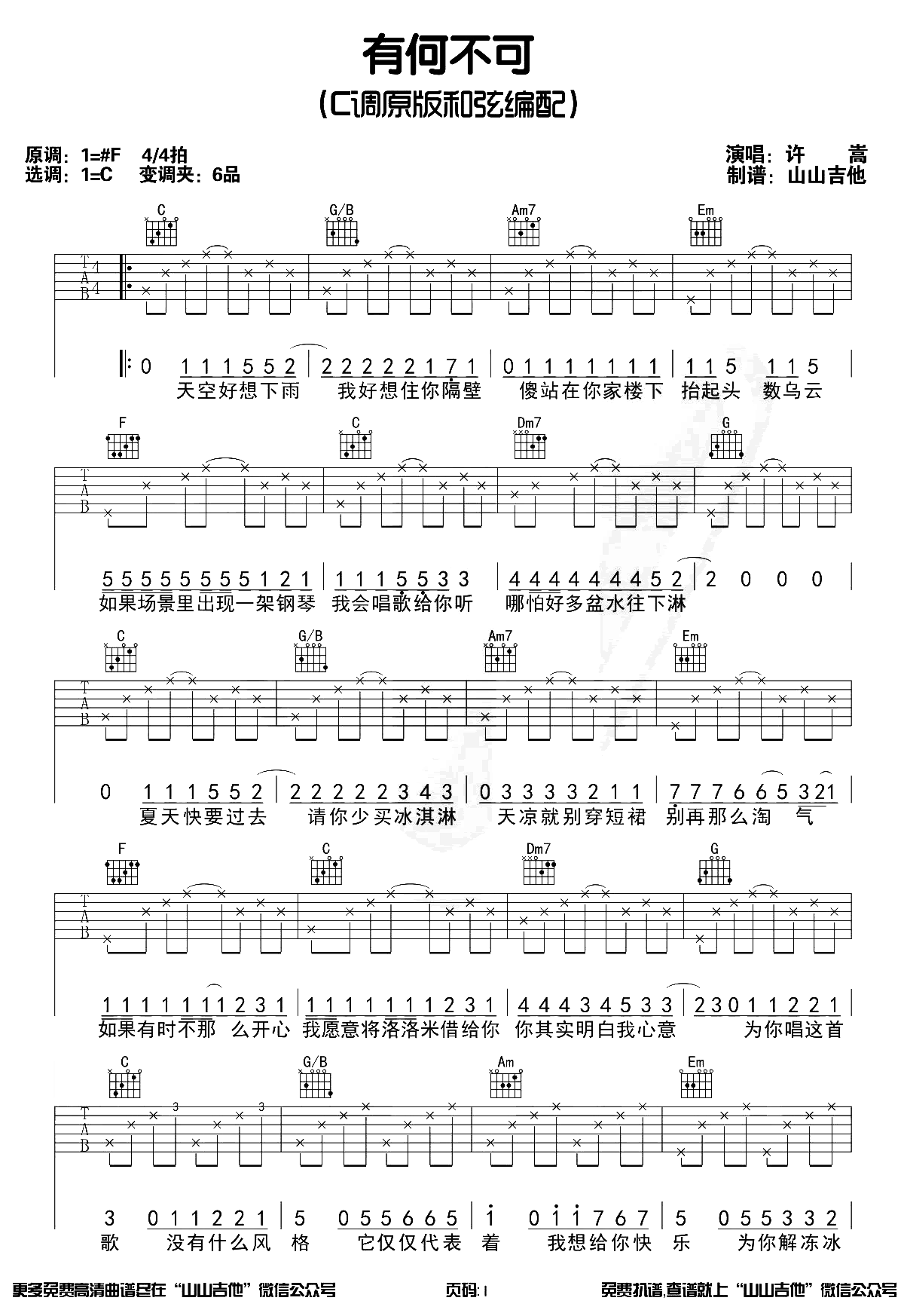 有何不可吉他谱 - 许嵩 - C调吉他弹唱谱 - 原版