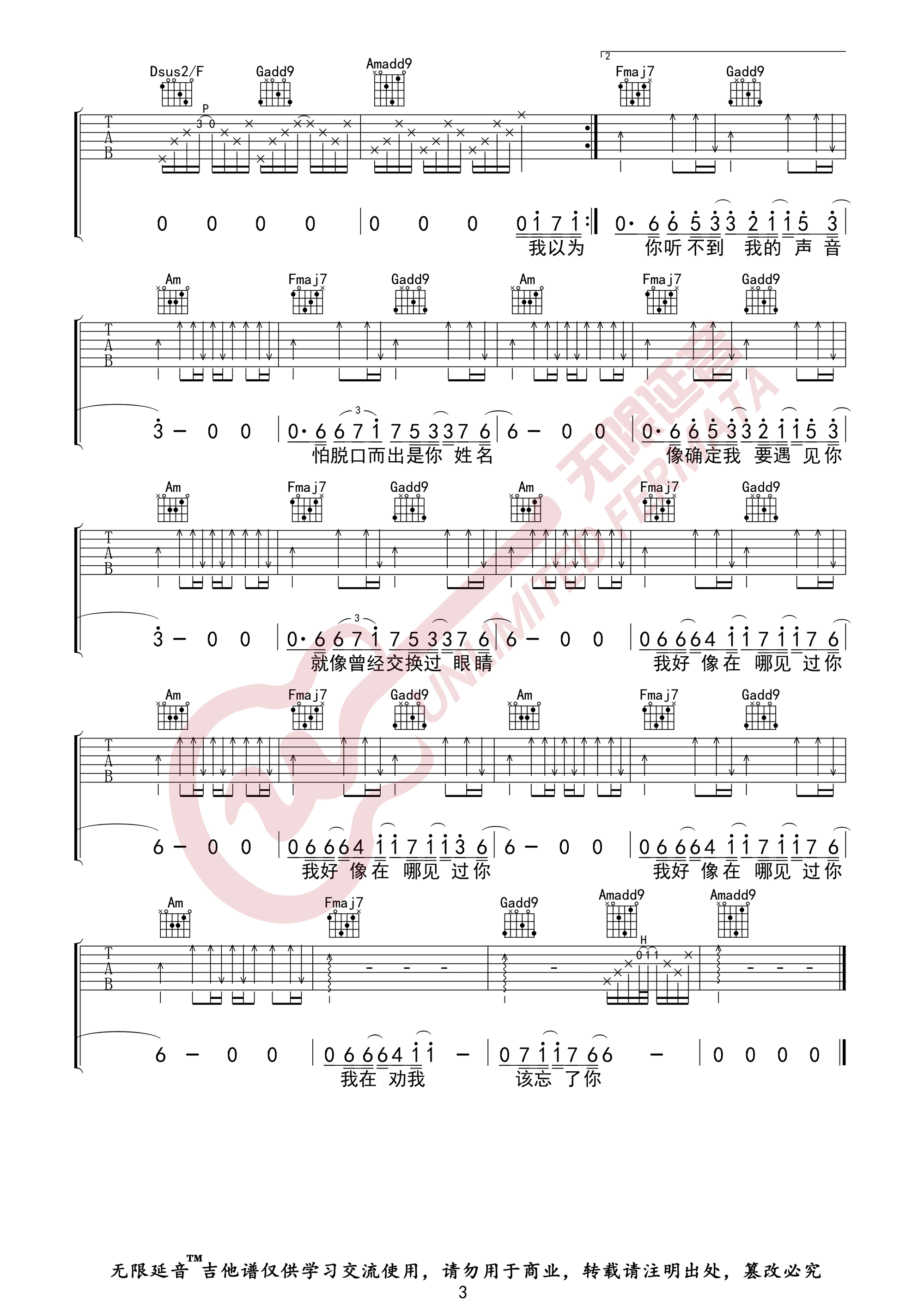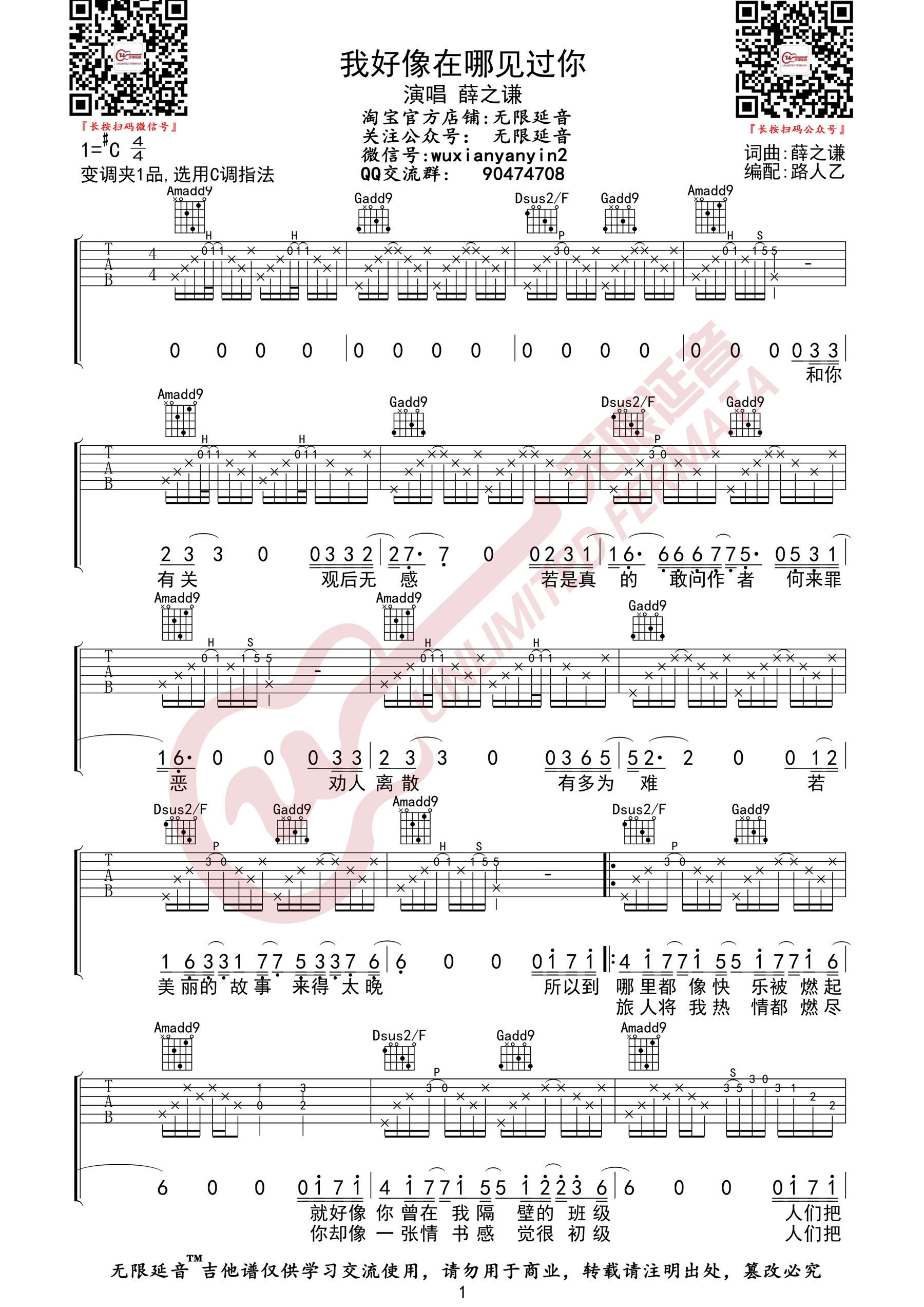 曲谱介绍: 吉他谱介绍:我好像在哪见过你吉他谱,薛之谦演唱的一首歌曲,4/4拍的节奏,这首歌曲的原调为#C调,这里曲谱采用了C调指法进行编配,演唱时夹变调夹1品可回到原调,也可根据个人实际嗓音情况选择。曲谱由琴谱网更新上传,共3张高清图片弹唱吉他谱例,来源于@无限延音编配出品。这首歌讲述了一个让人浮想联翩的爱情故事,歌词的音符缓缓地揭开了一段尘封已久的故事序幕,两个在前生有故事的人,今生却无法再续前缘,只好把爱埋在心里。疑惑中透露着伤感,充满着爱而不得。