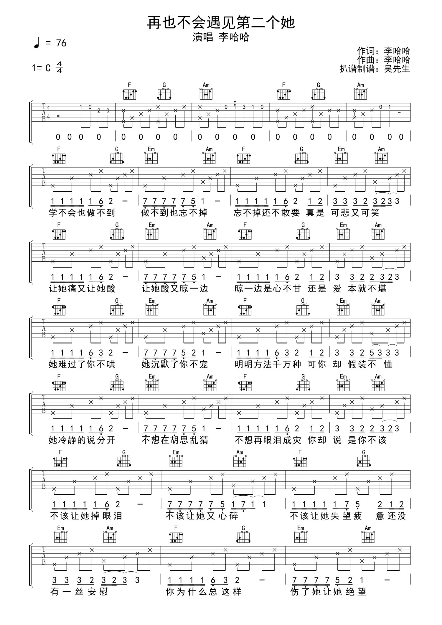 再也不会遇见第二个她吉他谱 - 李哈哈 - C调吉他弹唱谱