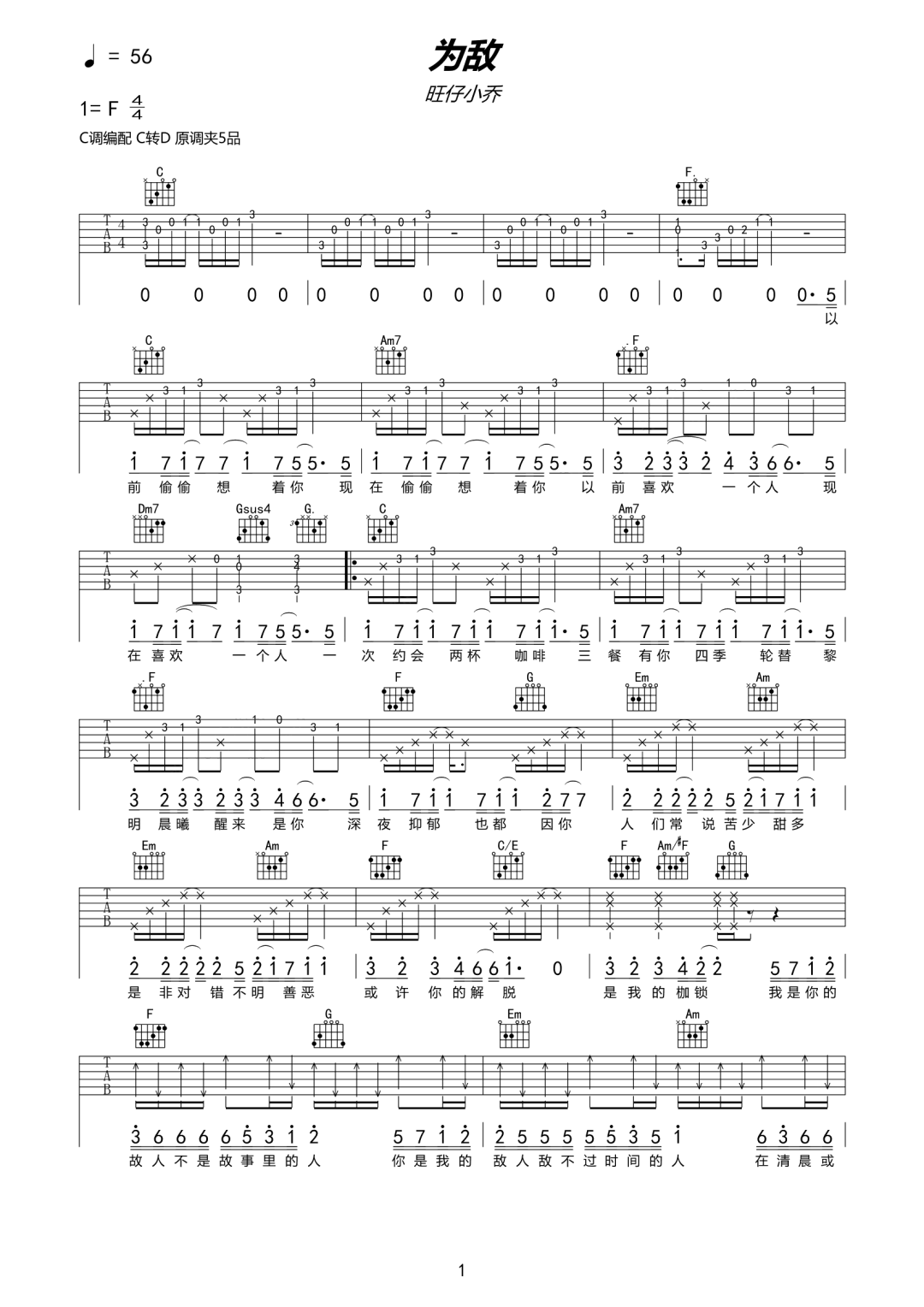 曲谱介绍: 吉他谱介绍:为敌吉他谱,旺仔小乔演唱的一首歌曲,4/4拍的节奏,这首歌曲的原调为F调,这里曲谱采用了C调指法进行编配,演唱时夹变调夹5品可回到原调,也可根据个人实际嗓音情况选择。曲谱由琴谱网更新上传,共2张高清图片弹唱吉他谱例,曲谱来源于网络转载,编配制谱者暂不详。