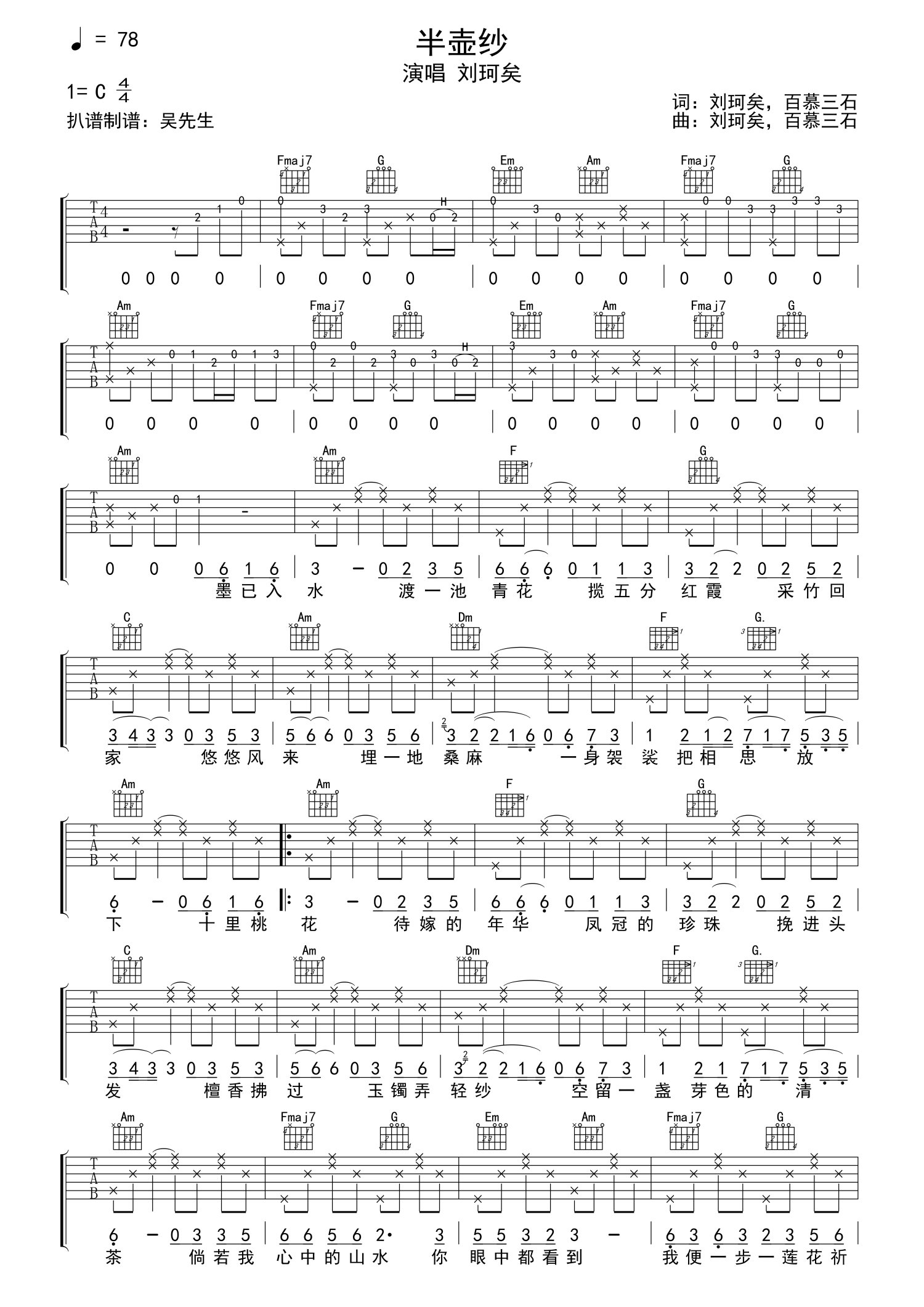 曲谱介绍: 刘珂矣《半壶纱》C调吉他谱_半壶纱六线谱
