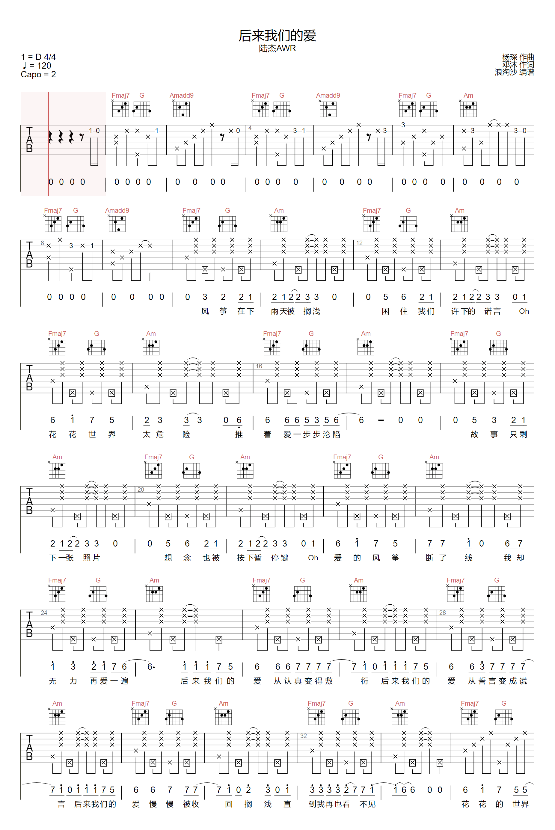 曲谱介绍: 吉他谱介绍:后来我们的爱吉他谱,陆杰AWR演唱的一首歌曲,4/4拍的节奏,这首歌曲的原调为D调,这里曲谱采用了C调指法进行编配,演唱时夹变调夹2品可回到原调,也可根据个人实际嗓音情况选择。曲谱由琴谱网更新上传,共2张高清图片弹唱吉他谱例,来源于@浪淘沙编配出品。