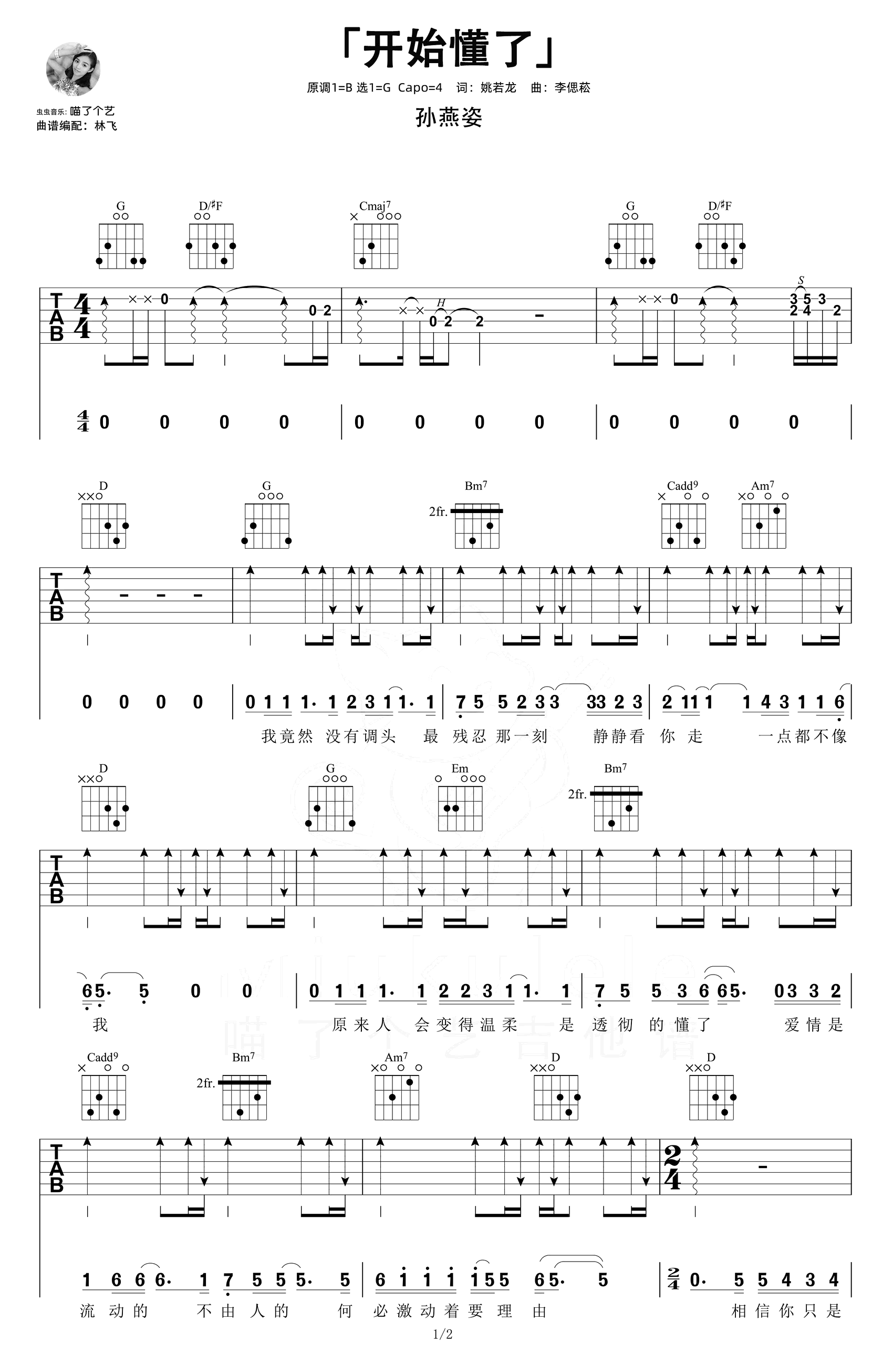 曲谱介绍: 孙燕姿《开始懂了》,一个懵懂而纯粹的人总是在感情的折磨之中渐渐看透了本质,这首歌用深入人心的方式,叫醒在感情不断投入而自己饱受伤害的人,开始懂了,重新去选择一种属于自己的快乐。 孙燕姿《开始懂了》吉他谱,共两张图片谱,由@喵了个艺制谱分享,选用G调指法,变调夹可夹4品弹唱原调,随谱附这首歌曲的弹唱演示视频,可以完整的参考后练习。