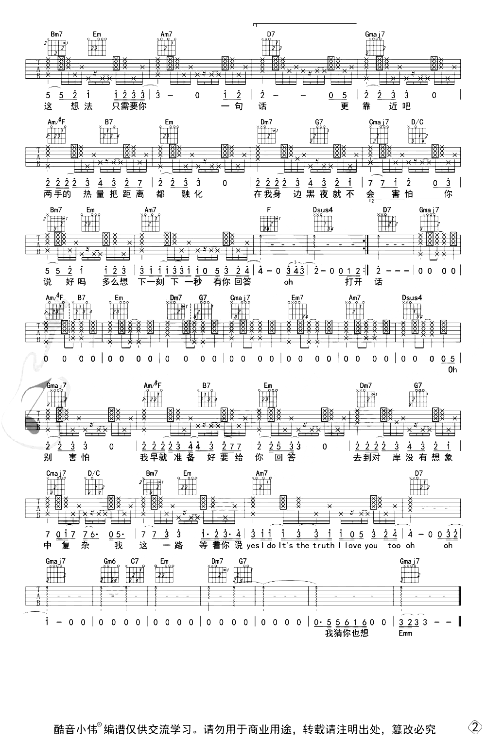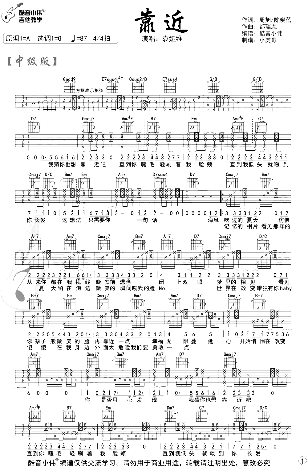 曲谱介绍: 靠近吉他谱,袁娅维在《为歌而赞》很赞的一次现场演唱,歌曲中太多的细节改编征服了听众的内心,让大家勾起当年对《爱情公寓3》的满满记忆,在跟随歌曲之中浪漫的旋律之下不失婉转的甜蜜跳跃。 《靠近》吉他弹唱谱,共两张图片谱,随谱附吉他弹唱演示+教学视频,选用G调指法,原调A调,速度87BPM,节奏4/4拍,根据自己嗓音情况调整变调夹位置,弹唱有一定难度,请参考视频多加练习。