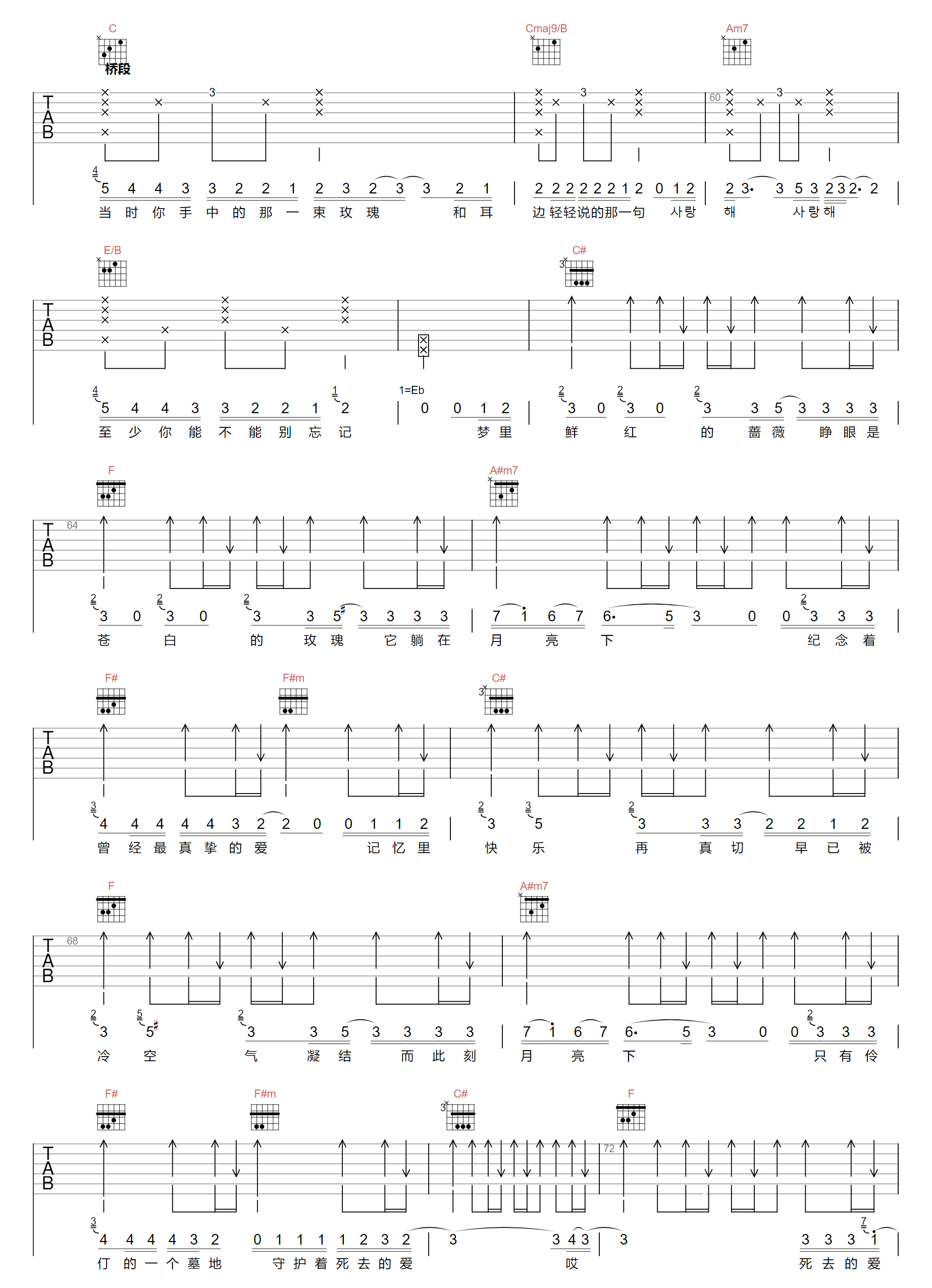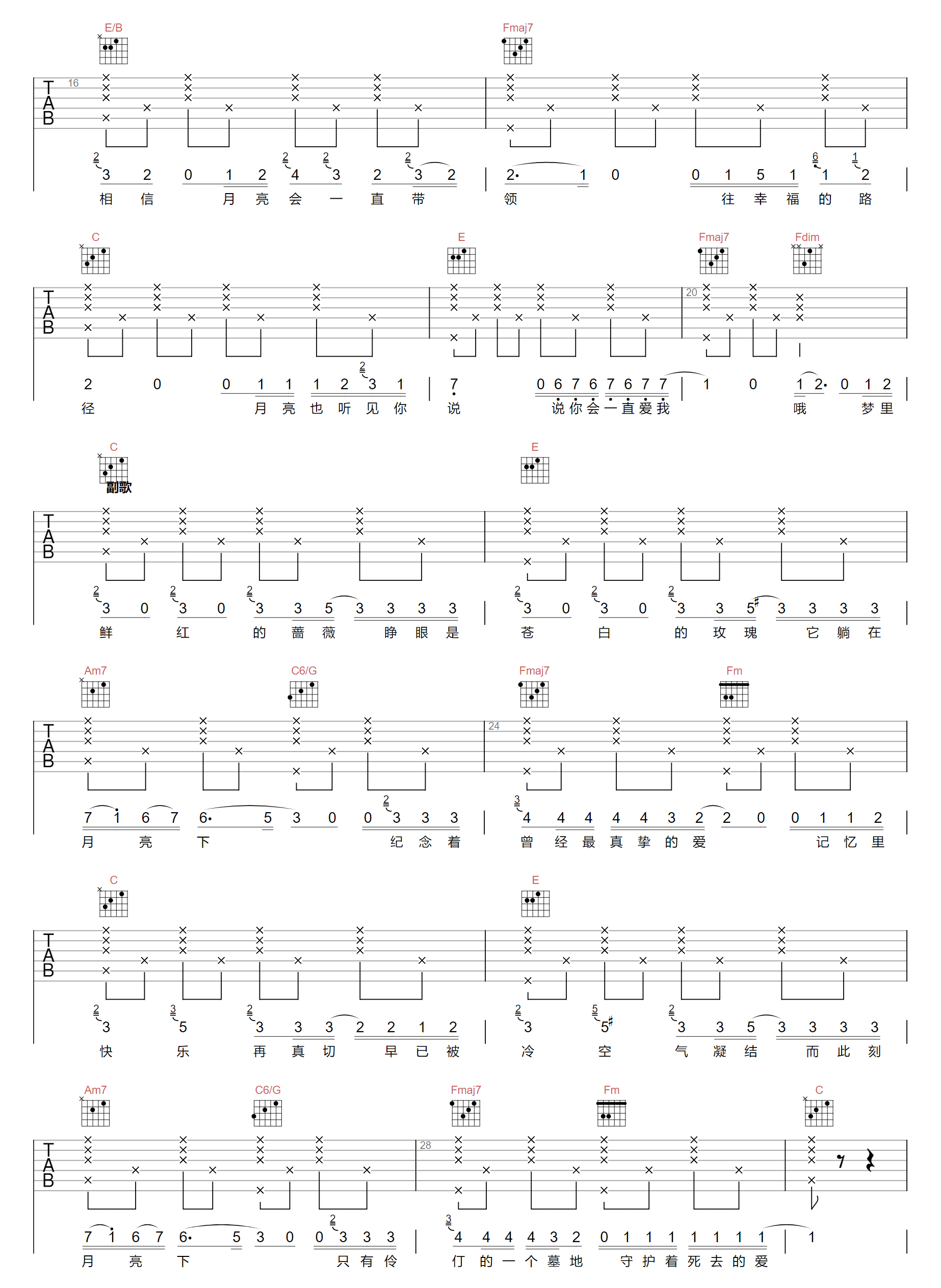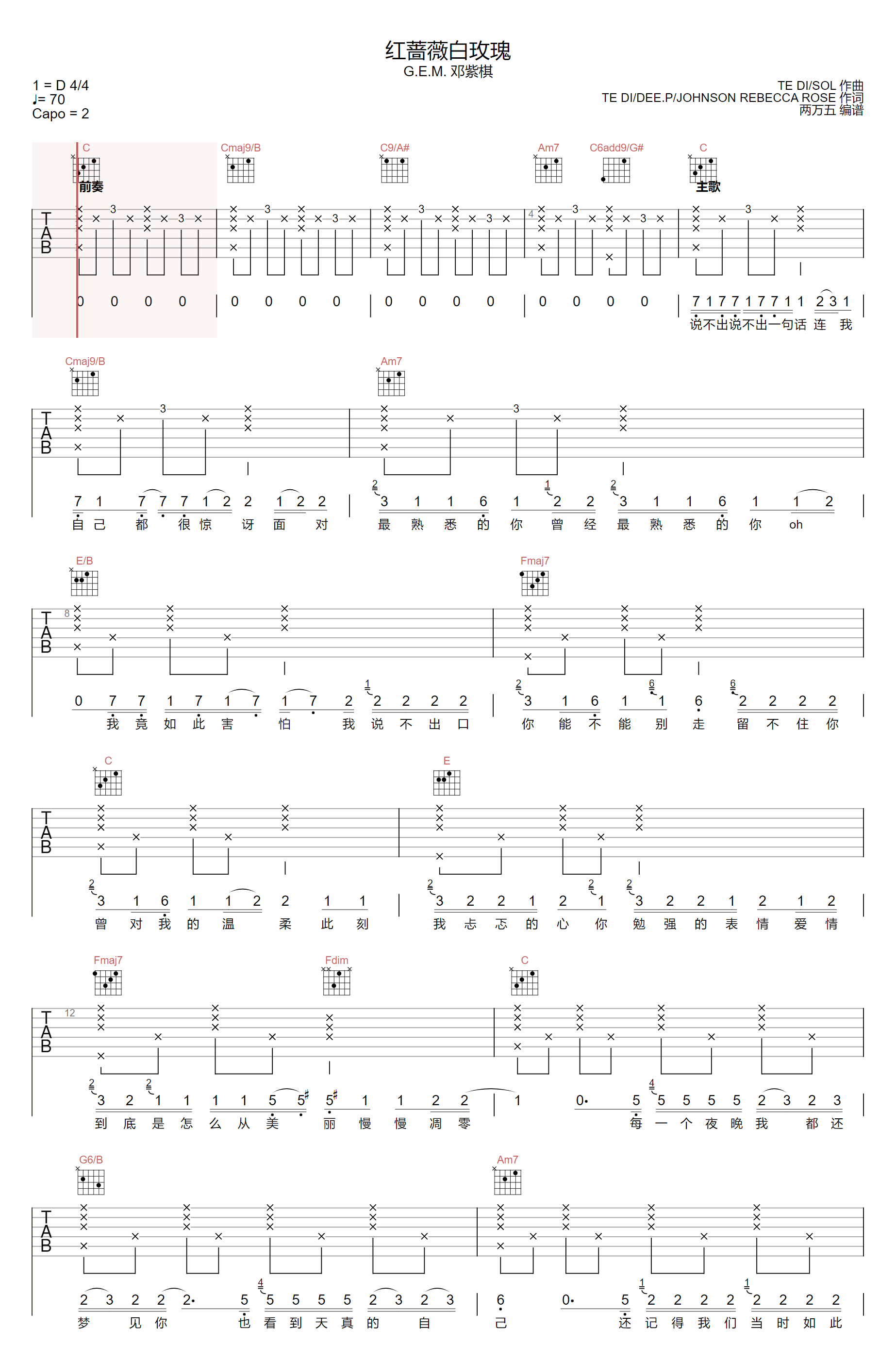 曲谱介绍: 吉他谱介绍:红蔷薇白玫瑰吉他谱,邓紫棋演唱的一首歌曲,4/4拍的节奏,这首歌曲的原调为,这里曲谱采用了C调指法进行编配,演唱时夹变调夹2品可回到原调,也可根据个人实际嗓音情况选择。曲谱由琴谱网更新上传,共6张高清图片弹唱吉他谱例,来源于@两万五编配出品。邓紫棋的唱腔像氤氲的迷雾,描绘出一幅画:一朵玫瑰躺在月亮下,纪念着曾经最真挚的爱。
