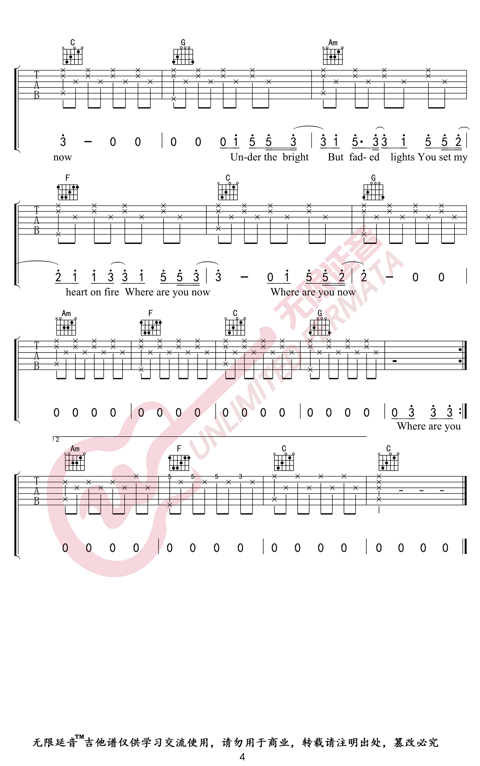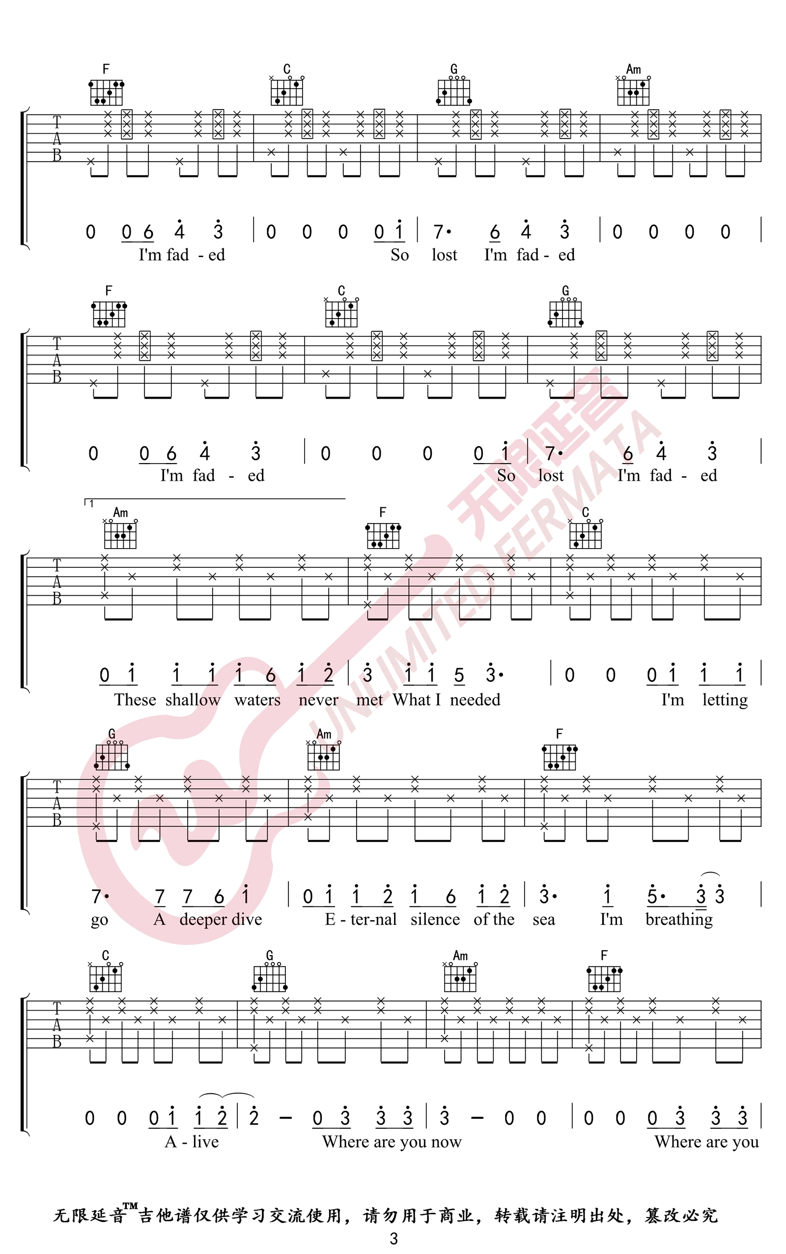 曲谱介绍: 吉他谱介绍:Faded吉他谱,Alan-Walker演唱的一首歌曲,4/4拍的节奏,这首歌曲的原调为#F调,这里曲谱采用了C调指法进行编配,演唱时夹变调夹6品可回到原调,也可根据个人实际嗓音情况选择。曲谱由琴谱网更新上传,共4张高清图片弹唱吉他谱例,来源于@无限延音编配出品。这首歌音乐旋律对于不去迪斯科的人来说也是超带感的,虽然听不懂歌词在说什么但是会觉得这首歌很好听,感觉是压抑了很久以后安静缓慢地爆发出来,直到最后一个音落下来,然后再来一次。