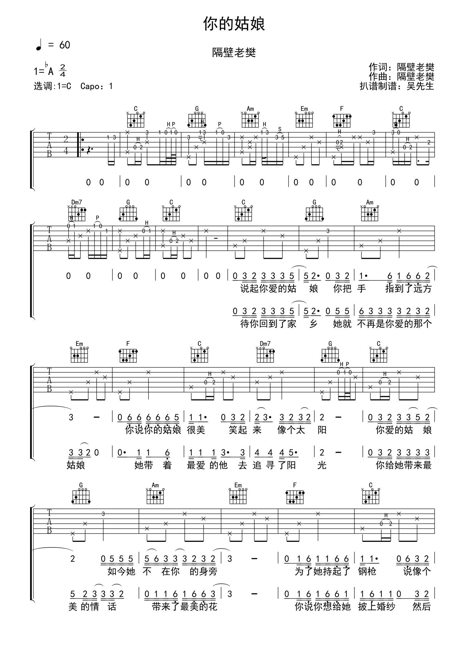 曲谱介绍: 隔壁老樊《你的姑娘》C调吉他谱吴先生编配版本