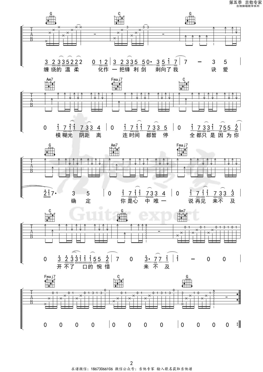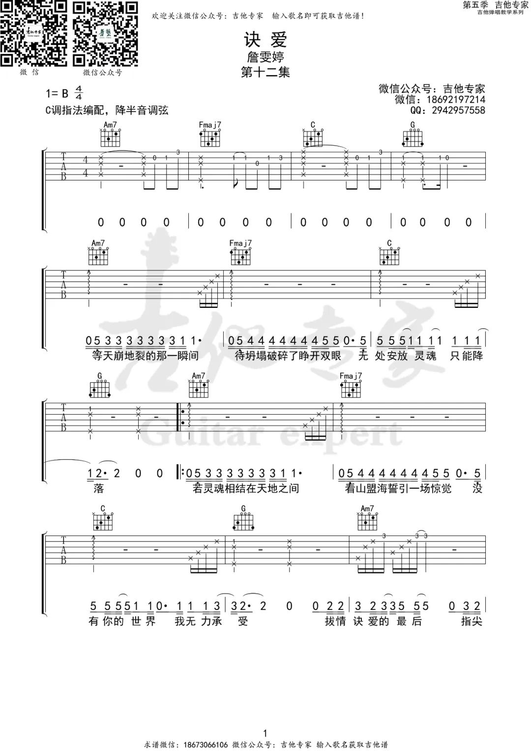 曲谱介绍: 吉他谱介绍:诀爱吉他谱,詹雯婷演唱的一首歌曲,4/4拍的节奏,这首歌曲的原调为B调,这里曲谱采用了C调指法进行编配,演唱时降半音调弦可回到原调,也可根据个人实际嗓音情况选择不降音或夹几品。曲谱由琴谱网更新上传,共2张高清图片弹唱吉他谱例,来源于@吉他专家编配出品。