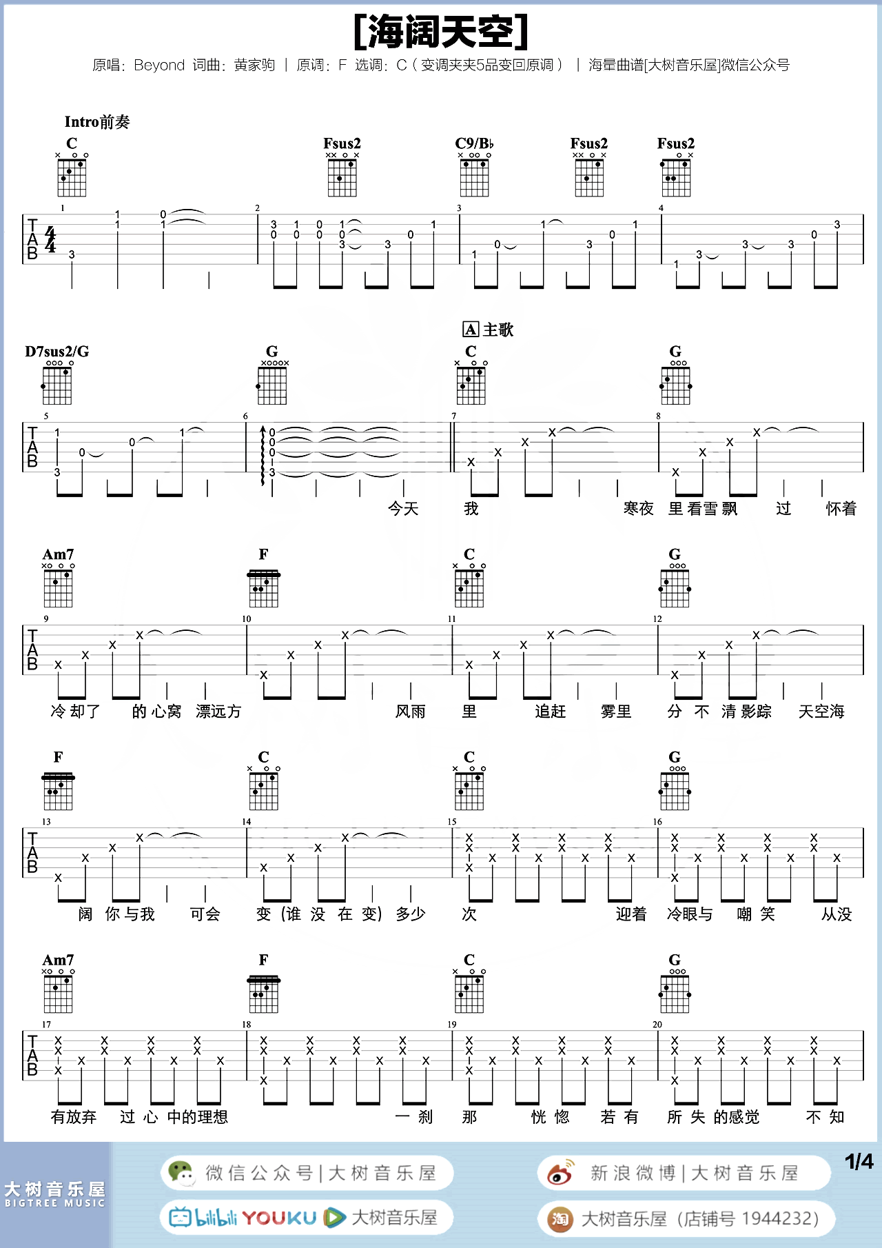 曲谱介绍: 《海阔天空》吉他弹唱教学 海阔天空吉他谱,一首Beyond的经典粤语歌,人这一生跌宕起伏,最后波折中经历风雨后越发从容,无论结果如何,“海阔天空”便是一种坚定过后的释然。 《海阔天空》吉他弹唱谱,共四张高清六线谱,选用C调,原调F调,变调夹夹5品弹唱原调,随谱附《海阔天空》吉他演示+教学视频,可跟随大树音乐屋一起练习哦!