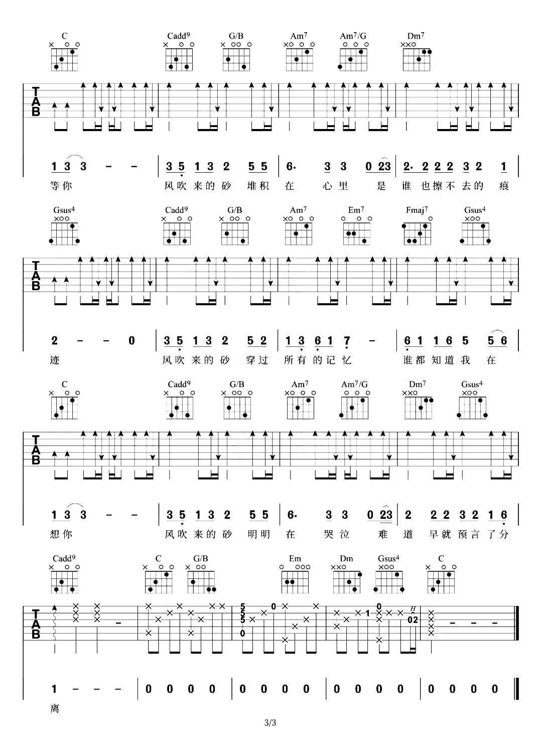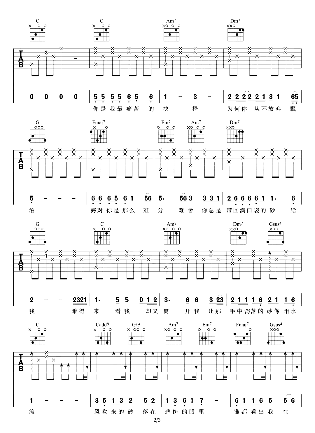 曲谱介绍: 《哭砂》是黄莺莺原唱的一首歌曲,在《天赐的声音3》,周周深与陈鸿宇又重新演唱了这首歌,不一样的编曲与演唱方式,都能够勾起我们内心深处的深刻共鸣。 黄莺莺《哭砂》吉他谱,共3张图片谱,选用C调指法,原调D调,变调夹可夹2品弹唱原调。