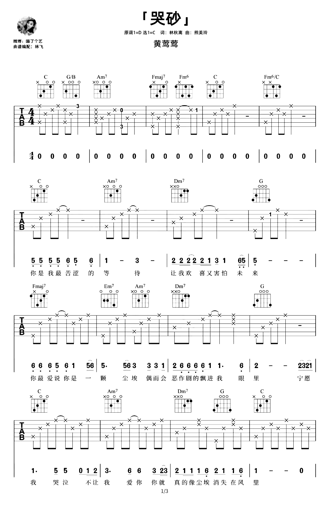 哭砂吉他谱 - 黄莺莺 - C调吉他弹唱谱 - 原版