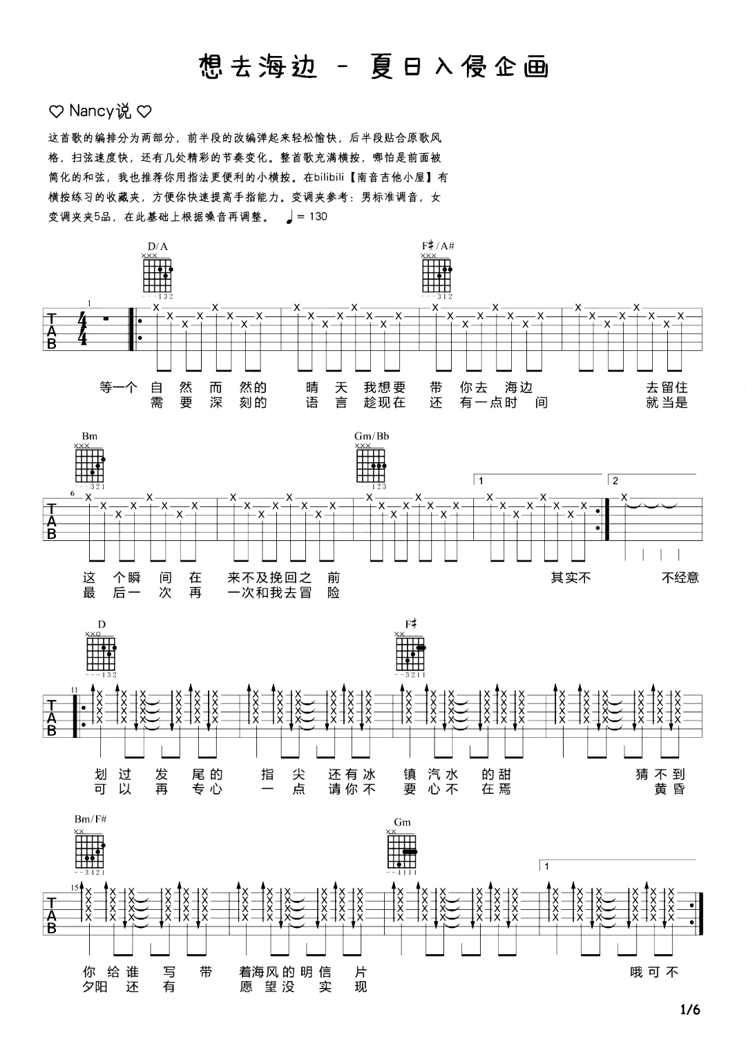 曲谱介绍: 这首歌来自夏日入侵企画的《想去海边》。每当这首歌的旋律响起时小编都有种置身海边的感觉,仿佛一瞬间所有的心思都被这首歌拉去了一个盛夏的海边。 想去海边吉他谱,由南音吉他制谱,速度130BPM,节奏4/4拍,随谱附吉他教学视频,