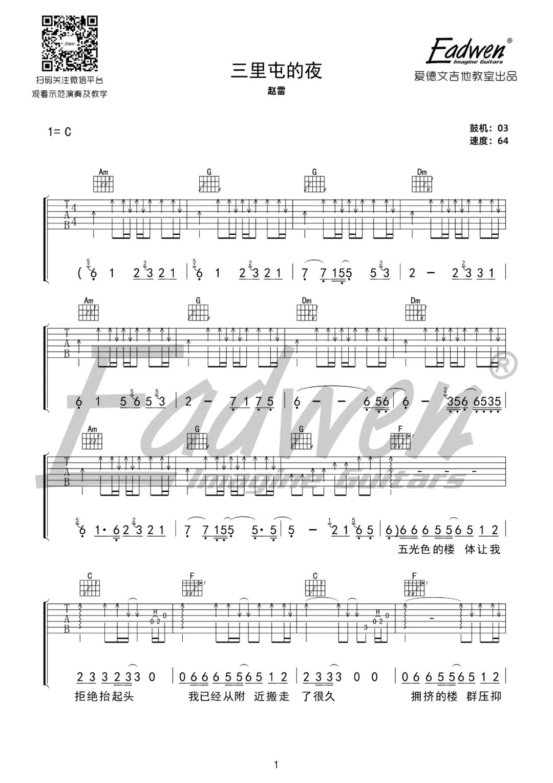 曲谱介绍: 吉他谱介绍:三里屯的夜吉他谱,赵雷演唱的一首歌曲,4/4拍的节奏,这首歌曲的原调为C调,这里曲谱采用了C调指法进行编配,演唱时可不夹变调夹,曲谱由琴谱网更新上传,共5张高清图片弹唱吉他谱例,来源于@爱德文吉他教室编配出品。 这首歌低声吟唱,娓娓道来,脱离了早年间《画》、《理想》 时期的那种年少对于现实生活无力而嘶吼的阶段,像一个过来人的自述,从流浪歌者转向吟游诗人。