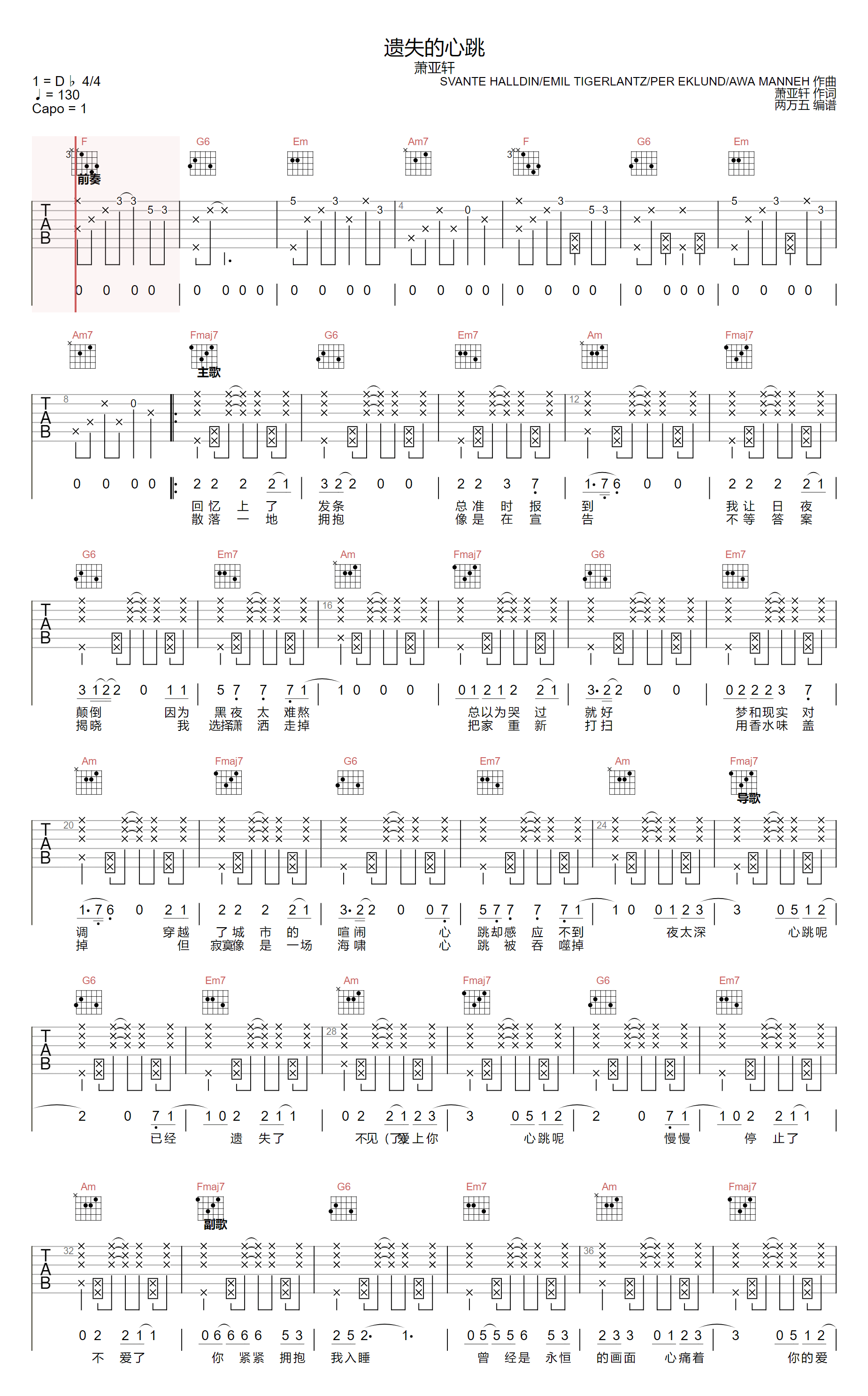 遗失的心跳吉他谱 - 萧亚轩 - C调吉他弹唱谱 - 原版
