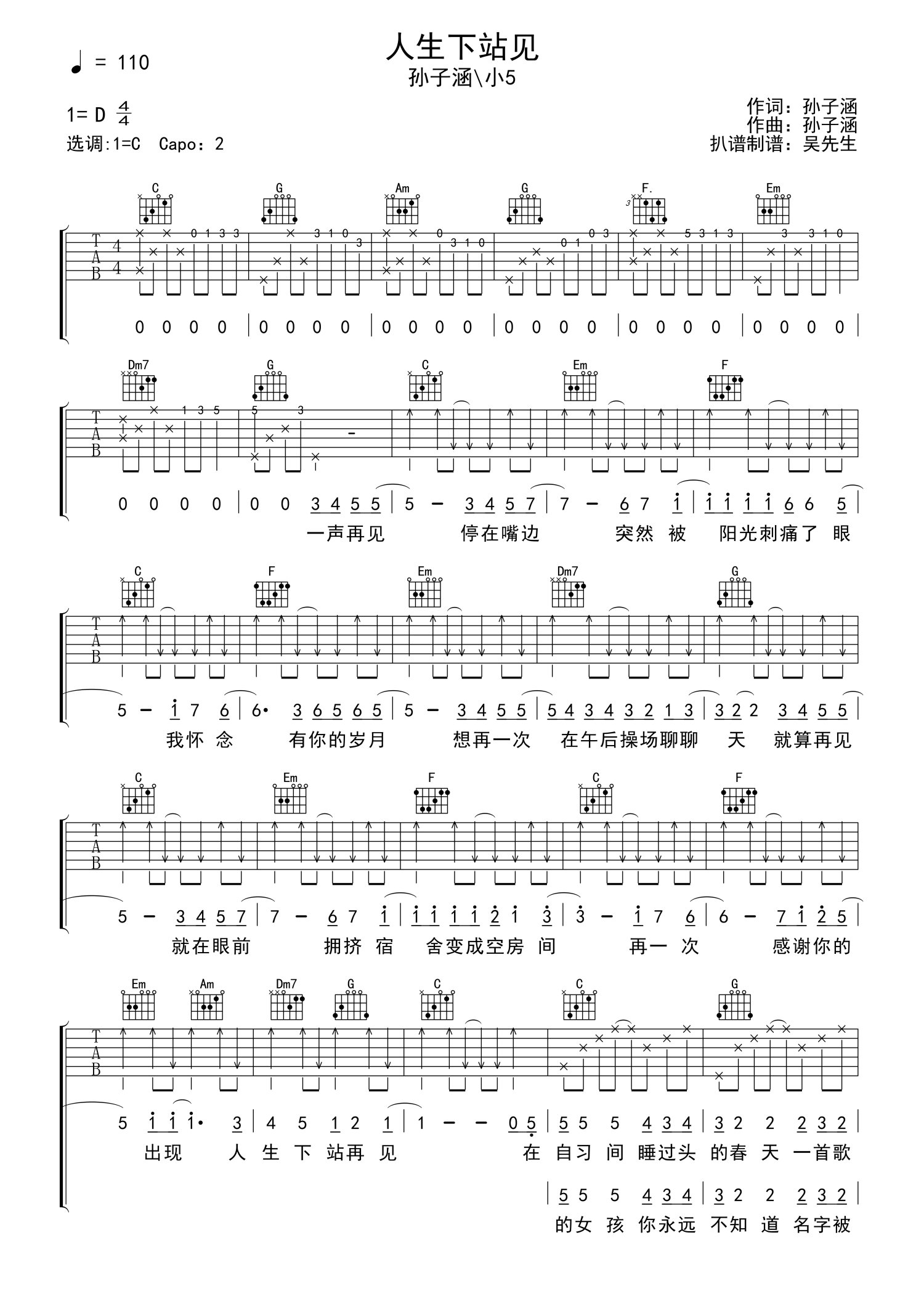 曲谱介绍: 人生下站见吉他谱,孙子涵演唱,一首献唱给毕业季的歌曲,人生下站见六线谱,原调D,选调C,CAPO夹二品